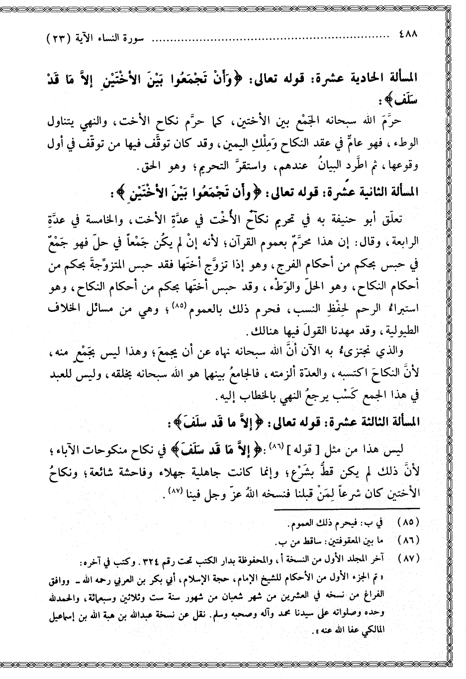 الْمَسْأَلَةُ الْحَادِيَةَ عَشْرَةَ: قَوْله تَعَالَى: {وَأَنْ تَجْمَعُوا بَيْنَ الأُخْتَيْنِ إِلا مَا قَدْ سَلَفَ} [النساء: 23] حَرَّمَ اللَّهُ سُبْحَانَهُ الْجَمْعَ بَيْنَ الْأُخْتَيْنِ، كَمَا حَرَّمَ نِكَاحَ الْأُخْتِ، وَالنَّهْيُ يَتَنَاوَلُ الْوَطْءَ، فَهُوَ عَامٌّ فِي عَقْدِ النِّكَاحِ وَمِلْكِ الْيَمِينِ، وَقَدْ كَانَ تَوَقَّفَ فِيهَا مَنْ تَوَقَّفَ فِي أَوَّلِ وُقُوعِهَا، ثُمَّ اطَّرَدَ الْبَيَانُ عِنْدَهُمْ، وَاسْتَقَرَّ التَّحْرِيمُ؛ وَهُوَ الْحَقُّ.