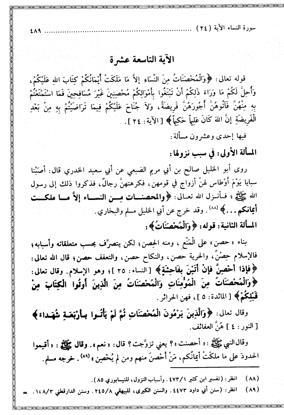 «وَقَالَ النَّبِيُّ - صَلَّى اللَّهُ عَلَيْهِ وَسَلَّمَ -: أَحْصَنَتْ؟ يَعْنِي تَزَوَّجَتْ؟ قَالَ: نَعَمْ». وَقَالَ - صَلَّى اللَّهُ عَلَيْهِ وَسَلَّمَ -: «أَقِيمُوا الْحُدُودَ عَلَى مَا مَلَكَتْ أَيْمَانُكُمْ، مَنْ أُحْصِنَ مِنْهُمْ وَمَنْ لَمْ يُحْصِنْ». خَرَّجَهُ مُسْلِمٌ.