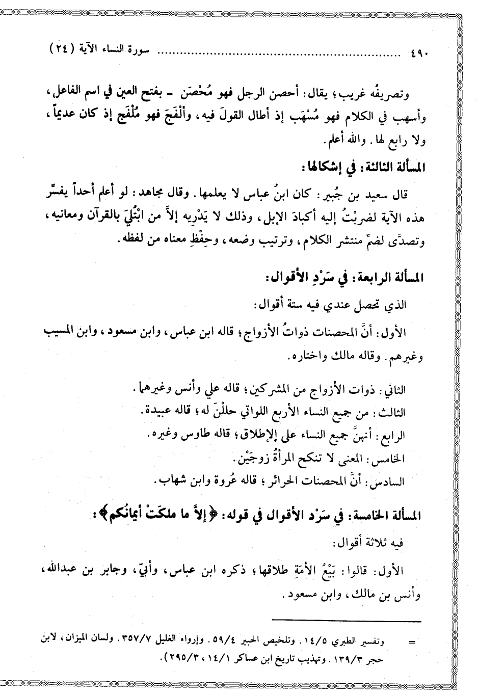 الْمَسْأَلَةُ الْخَامِسَةُ: فِي سَرْدِ الْأَقْوَالِ فِي قَوْلِهِ: {إِلا مَا مَلَكَتْ أَيْمَانُكُمْ} [النساء: 24]: فِيهِ ثَلَاثَةُ أَقْوَالٍ: الْأَوَّلُ: قَالُوا: بَيْعُ الْأَمَةِ طَلَاقَهَا؛ ذَكَرَهُ ابْنُ عَبَّاسٍ، وَأُبَيُّ، وَجَابِرُ بْنُ عَبْدِ اللَّهِ، وَأَنَسُ بْنُ مَالِكٍ، وَابْنُ مَسْعُودٍ.