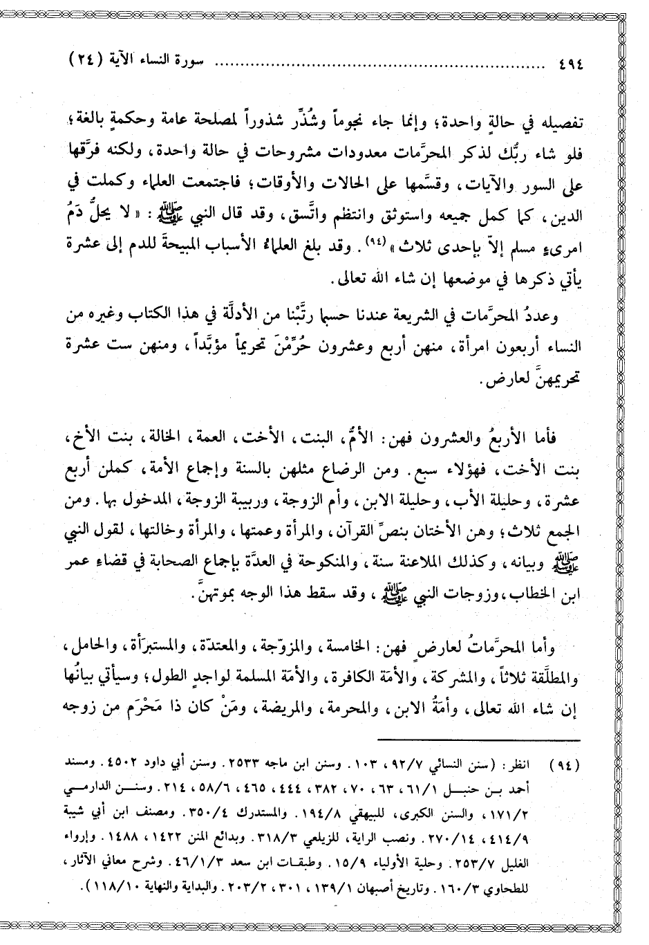 تَفْصِيلِهِ فِي حَالَةٍ وَاحِدَةٍ؛ وَإِنَّمَا جَاءَ نُجُومًا وَشُذِّرَ شُذُورًا لِمَصْلَحَةٍ عَامَّةٍ وَحِكْمَةٍ بَالِغَةٍ؛ فَلَوْ شَاءَ رَبُّكَ لَذَكَرَ الْمُحَرَّمَاتِ مَعْدُودَاتٍ مَشْرُوحَاتٍ فِي حَالَةٍ وَاحِدَةٍ، وَلَكِنَّهُ فَرَّقَهَا عَلَى السُّوَرِ وَالْآيَاتِ، وَقَسَّمَهَا عَلَى الْحَالَاتِ وَالْأَوْقَاتِ؛ فَاجْتَمَعَتْ الْعُلَمَاءُ وَكَمُلَتْ فِي الدِّينِ، كَمَا كَمُلَ جَمِيعُهُ وَاسْتَوْثَقَ وَانْتَظَمَ وَاتَّسَقَ، وَقَدْ قَالَ النَّبِيُّ - صَلَّى اللَّهُ عَلَيْهِ وَسَلَّمَ -: «لَا يَحِلُّ دَمُ امْرِئٍ مُسْلِمٍ إلَّا بِإِحْدَى ثَلَاثٍ».