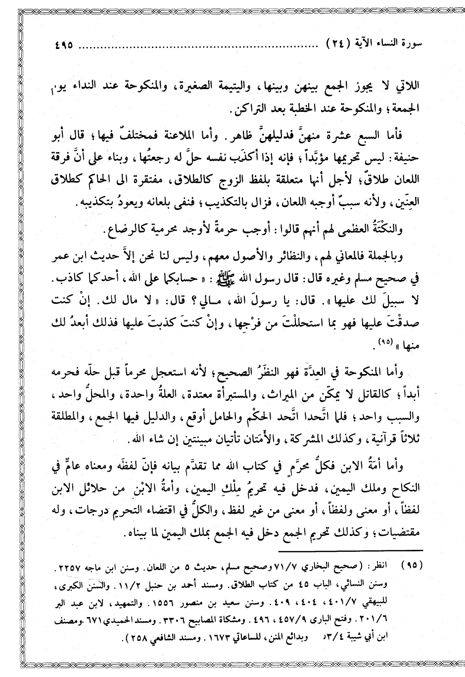 وَبِالْجُمْلَةِ فَالْمَعَانِي لَهُمْ، وَالنَّظَائِرُ وَالْأُصُولُ مَعَهُمْ، وَلَيْسَ لَنَا نَحْنُ إلَّا حَدِيثُ ابْنِ عُمَرَ فِي صَحِيحِ مُسْلِمٍ وَغَيْرِهِ قَالَ: قَالَ رَسُولُ اللَّهِ - صَلَّى اللَّهُ عَلَيْهِ وَسَلَّمَ -: «حِسَابُكُمَا عَلَى اللَّهِ، أَحَدُكُمَا كَاذِبٌ. لَا سَبِيلَ لَك عَلَيْهَا. قَالَ: يَا رَسُولَ اللَّهِ، مَالِي؟ قَالَ: لَا مَالَ لَكَ. إنْ كُنْت صَدَقْت عَلَيْهَا فَهُوَ بِمَا اسْتَحْلَلْت مِنْ فَرْجِهَا، وَإِنْ كُنْت كَذَبْت عَلَيْهَا فَذَلِكَ أَبْعَدُ لَكَ مِنْهَا». وَأَمَّا الْمَنْكُوحَةُ فِي الْعِدَّةِ فَهُوَ النَّظَرُ الصَّحِيحُ؛ لِأَنَّهُ اسْتَعْجَلَ مُحَرَّمًا قَبْلَ حِلِّهِ فَحَرَّمَهُ أَبَدًا؛ كَالْقَاتِلِ لَا يُمَكَّنُ مِنْ الْمِيرَاثِ، وَالْمُسْتَبْرَأَة مُعْتَدَّةٌ، الْعِلَّةُ وَاحِدَةٌ، وَالْمَحِلُّ وَاحِدٌ، وَالسَّبَبُ وَاحِدٌ؛ فَلَمَّا اتَّحَدَا اتَّحَدَ الْحُكْمُ وَالْحَامِلُ أَوْقَعُ، وَالدَّلِيلُ فِيهَا الْجَمْعُ، وَالْمُطَلَّقَةُ ثَلَاثًا قُرْآنِيَّةً، وَكَذَلِكَ الْمُشْرِكَةُ، وَالْأَمَتَانِ تَأْتِيَانِ مُبَيِّنَتَيْنِ إنْ شَاءَ اللَّهُ. وَأَمَّا أَمَةُ الِابْنِ فَكُلُّ مُحَرَّمٍ فِي كِتَابِ اللَّهِ مِمَّا تَقَدَّمَ بَيَانُهُ فَإِنَّ لَفْظَهُ وَمَعْنَاهُ عَامٌّ فِي النِّكَاحِ وَمِلْكِ الْيَمِينِ، فَدَخَلَ فِيهِ تَحْرِيمُ مِلْكِ الْيَمِينِ، وَأَمَةُ الِابْنِ مِنْ حَلَائِلِ الِابْنِ لَفْظًا، أَوْ مَعْنًى وَلَفْظًا، أَوْ مَعْنًى مِنْ غَيْرِ لَفْظٍ، وَالْكُلُّ فِي اقْتِضَاءِ التَّحْرِيمِ دَرَجَاتٌ، وَلَهُ مُقْتَضَيَاتٌ؛ وَكَذَلِكَ تَحْرِيمُ الْجَمْعِ دَخَلَ فِيهِ الْجَمْعُ بِمِلْكِ الْيَمِينِ لِمَا بَيَّنَّاهُ.