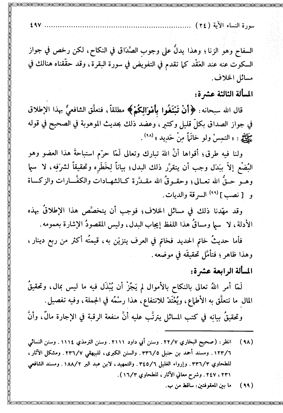 الْمَسْأَلَةُ الثَّالِثَةُ عَشْرَةَ: قَالَ اللَّهُ سُبْحَانَهُ: {أَنْ تَبْتَغُوا بِأَمْوَالِكُمْ} [النساء: 24] مُطْلَقًا، فَتَعَلَّقَ الشَّافِعِيُّ بِهَذَا الْإِطْلَاقِ فِي جَوَازِ الصَّدَاقِ بِكُلِّ قَلِيلٍ وَكَثِيرٍ، وَعَضَّدَ ذَلِكَ بِحَدِيثِ الْمَوْهُوبَةِ فِي الصَّحِيحِ فِي قَوْلِهِ - صَلَّى اللَّهُ عَلَيْهِ وَسَلَّمَ -: «الْتَمِسْ وَلَوْ خَاتَمًا مِنْ حَدِيدٍ».
