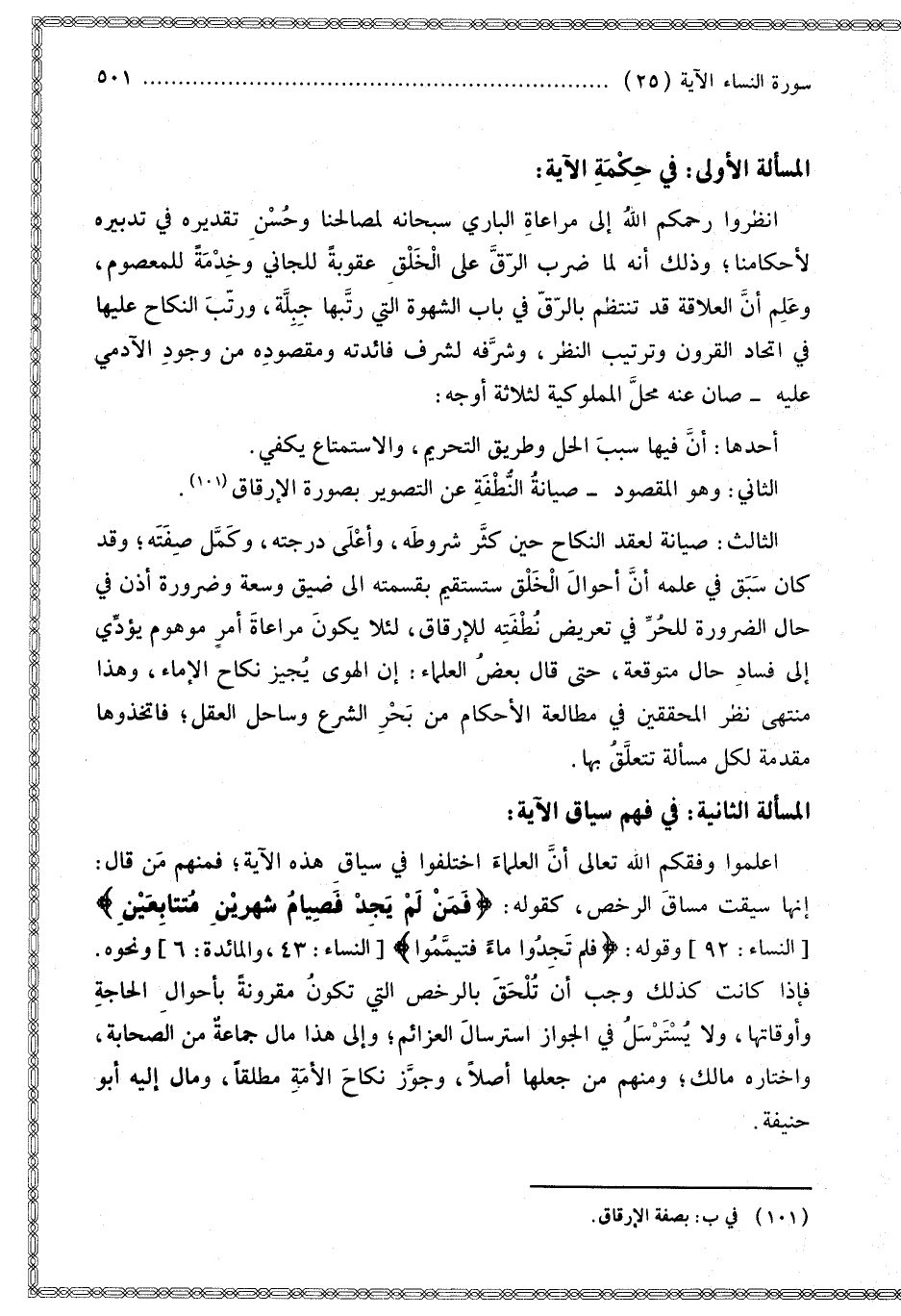 الْمَسْأَلَةُ الثَّانِيَةُ: فِي فَهْمِ سِيَاقِ الْآيَةِ: اعْلَمُوا وَفَّقَكُمْ اللَّهُ تَعَالَى أَنَّ الْعُلَمَاءَ اخْتَلَفُوا فِي سِيَاقِ هَذِهِ الْآيَةِ؛ فَمِنْهُمْ مَنْ قَالَ: إنَّهَا سِيقَتْ مَسَاقَ الرُّخَصِ، كَقَوْلِهِ: {فَمَنْ لَمْ يَجِدْ فَصِيَامُ شَهْرَيْنِ مُتَتَابِعَيْنِ} [النساء: 92] وَقَوْلِهِ: {فَلَمْ تَجِدُوا مَاءً فَتَيَمَّمُوا} [النساء: 43] وَنَحْوُهُ. فَإِذَا كَانَتْ كَذَلِكَ وَجَبَ أَنْ تُلْحَقَ بِالرُّخَصِ الَّتِي تَكُونُ مَقْرُونَةً بِأَحْوَالِ الْحَاجَةِ وَأَوْقَاتِهَا، وَلَا يَسْتَرْسِلُ فِي الْجَوَازِ اسْتِرْسَالَ الْعَزَائِمِ؛ وَإِلَى هَذَا مَالَ جَمَاعَةٌ مِنْ الصَّحَابَةِ، وَاخْتَارَهُ مَالِكٌ؛ وَمِنْهُمْ مَنْ جَعَلَهَا أَصْلًا، وَجَوَّزَ نِكَاحَ الْأَمَةِ مُطْلَقًا، وَمَالَ إلَيْهِ أَبُو حَنِيفَةَ.