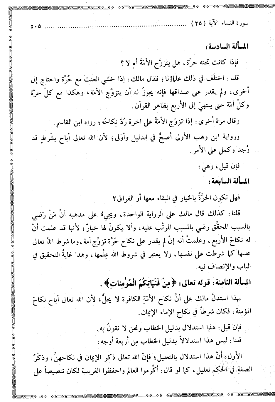 الْمَسْأَلَةُ الثَّامِنَةُ: قَوْله تَعَالَى: {مِنْ فَتَيَاتِكُمُ الْمُؤْمِنَاتِ} [النساء: 25]. بِهَذَا اسْتَدَلَّ مَالِكٌ عَلَى أَنَّ نِكَاحَ الْأَمَةِ الْكَافِرَةِ لَا يَحِلُّ؛ لِأَنَّ اللَّهَ تَعَالَى أَبَاحَ نِكَاحَ الْمُؤْمِنَةِ، فَكَانَ شَرْطًا فِي نِكَاحِ الْإِمَاءِ الْإِيمَانُ. فَإِنْ قِيلَ: هَذَا اسْتِدْلَالٌ بِدَلِيلِ الْخِطَابِ وَنَحْنُ لَا نَقُولُ بِهِ. قُلْنَا: لَيْسَ هَذَا اسْتِدْلَالًا بِدَلِيلِ الْخِطَابِ مِنْ أَرْبَعَةِ أَوْجُهٍ: