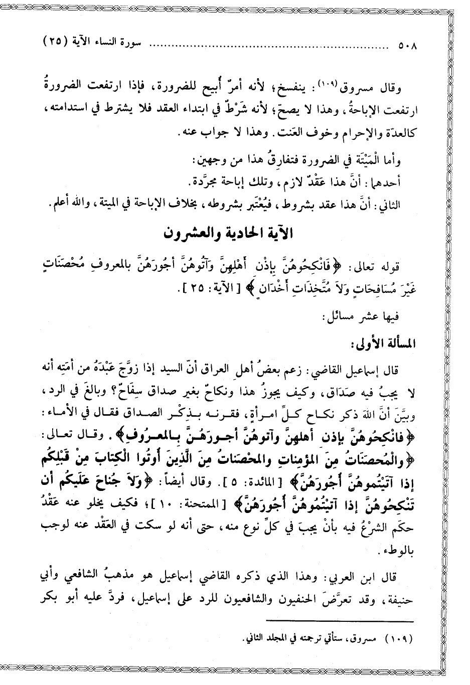 ِ مُحْصَنَاتٍ غَيْرَ مُسَافِحَاتٍ وَلا مُتَّخِذَاتِ أَخْدَانٍ} [النساء: 25]. فِيهَا عَشْرُ مَسَائِلَ: