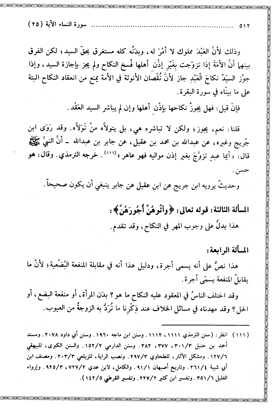 الْمَسْأَلَةُ الثَّالِثَةُ: قَوْله تَعَالَى: {وَآتُوهُنَّ أُجُورَهُنَّ} [النساء: 25]: هَذَا يَدُلُّ عَلَى وُجُوبِ الْمَهْرِ فِي النِّكَاحِ، وَقَدْ تَقَدَّمَ.
