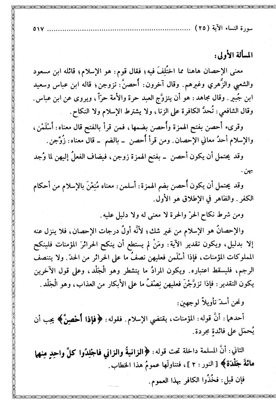 وَقَدْ يُحْتَمَلَ أَنْ يَكُونَ أَحْصَنَّ بِفَتْحِ الْهَمْزَةِ زُوِّجْنَ، فَيُضَافُ الْفِعْلُ إلَيْهِنَّ لِمَا وُجِدَ بِهِنَّ. وَقَدْ يَحْتَمِلُ أَنْ يَكُونَ أُحْصِنَّ بِضَمِّ الْهَمْزَةِ: أَسْلَمْنَ: مَعْنَاهُ مُنِعْنَ بِالْإِسْلَامِ مِنْ أَحْكَامِ الْكُفْرِ. وَالظَّاهِرُ فِي الْإِطْلَاقِ هُوَ الْأَوَّلُ. وَمَنْ شَرَطَ نِكَاحَ الْحُرِّ وَالْحُرَّةِ لَا مَعْنَى لَهُ وَلَا دَلِيلَ عَلَيْهِ. وَالْإِحْصَانُ هُوَ الْإِسْلَامُ مِنْ غَيْرِ شَكٍّ؛ لِأَنَّهُ أَوَّلُ دَرَجَاتِ الْإِحْصَانِ، فَلَا يَنْزِلُ عَنْهُ إلَّا بِدَلِيلٍ، وَيَكُونُ تَقْدِيرُ الْآيَةِ: وَمَنْ لَمْ يَسْتَطِعْ أَنْ يَنْكِحَ الْحَرَائِرَ الْمُؤْمِنَاتِ فَلْيَنْكِحْ الْمَمْلُوكَاتِ الْمُؤْمِنَاتِ، فَإِذَا أَسْلَمْنَ فَعَلَيْهِنَّ نِصْفُ مَا عَلَى الْحَرَائِرِ مِنْ الْحَدِّ. وَلَا يَتَنَصَّفُ الرَّجْمُ، فَلْيَسْقُطْ اعْتِبَارُهُ. وَيَكُونُ الْمُرَادُ مَا يَتَشَطَّرُ وَهُوَ الْجَلْدُ، وَعَلَى قَوْلِ الْآخَرِينَ يَكُونُ التَّقْدِيرُ: فَإِذَا تَزَوَّجْنَ فَعَلَيْهِنَّ نِصْفُ مَا عَلَى الْأَبْكَارِ مِنْ الْعَذَابِ، وَهُوَ الْجَلْدُ. وَنَحْنُ أَسَدُّ تَأْوِيلًا لِوَجْهَيْنِ: أَحَدُهُمَا: أَنَّ قَوْلَهُ: الْمُؤْمِنَاتُ، يَقْتَضِي الْإِسْلَامَ. فَقَوْلُهُ: {فَإِذَا أُحْصِنَّ} [النساء: 25] يَجِبُ أَنْ يُحْمَلَ عَلَى فَائِدَةٍ مُجَرَّدَةٍ.