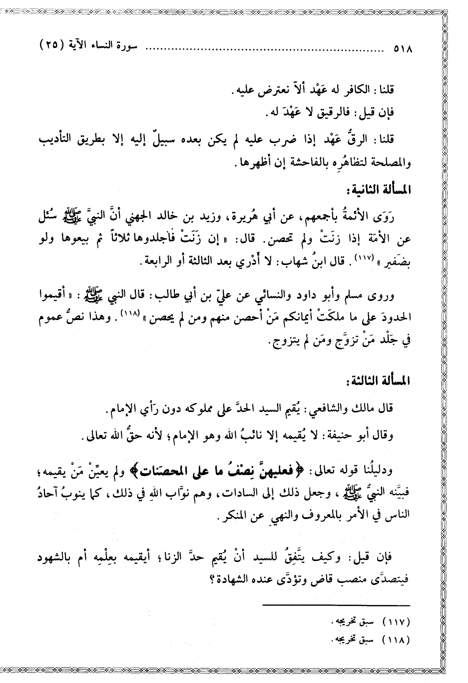 الْمَسْأَلَةُ الثَّانِيَةُ: رَوَى الْأَئِمَّةُ بِأَجْمَعِهِمْ عَنْ أَبِي هُرَيْرَةَ، وَزَيْدِ بْنِ خَالِدٍ الْجُهَنِيِّ «أَنَّ النَّبِيّ - صَلَّى اللَّهُ عَلَيْهِ وَسَلَّمَ - سُئِلَ عَنْ الْأَمَةِ إذَا زَنَتْ وَلَمْ تُحْصِنْ. قَالَ: إنْ زَنَتْ فَاجْلِدُوهَا ثَلَاثًا ثُمَّ بِيعُوهَا وَلَوْ بِضَفِيرٍ». قَالَ ابْنُ شِهَابٍ: لَا أَدْرِي بَعْدَ الثَّالِثَةِ أَوْ الرَّابِعَةِ. وَرَوَى مُسْلِمٌ وَأَبُو دَاوُد وَالنَّسَائِيُّ عَنْ عَلِيِّ بْنِ أَبِي طَالِبٍ: قَالَ النَّبِيُّ - صَلَّى اللَّهُ عَلَيْهِ وَسَلَّمَ -: «أَقِيمُوا الْحُدُودَ عَلَى مَا مَلَكَتْ أَيْمَانُكُمْ مَنْ أَحْصَنَ مِنْهُمْ وَمَنْ لَمْ يُحْصِنْ». وَهَذَا نَصُّ عُمُومٍ فِي جَلْدِ مَنْ تَزَوَّجَ وَمَنْ لَمْ يَتَزَوَّجْ.