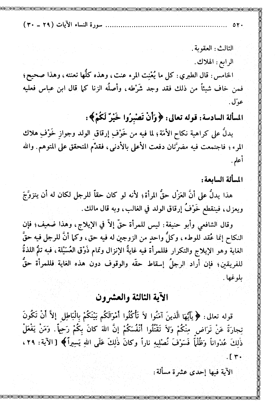 ِ إِلا أَنْ تَكُونَ تِجَارَةً عَنْ تَرَاضٍ مِنْكُمْ وَلا تَقْتُلُوا أَنْفُسَكُمْ إِنَّ اللَّهَ كَانَ بِكُمْ رَحِيمًا} [النساء: 29] {وَمَنْ يَفْعَلْ ذَلِكَ عُدْوَانًا وَظُلْمًا فَسَوْفَ نُصْلِيهِ نَارًا وَكَانَ ذَلِكَ عَلَى اللَّهِ يَسِيرًا} [النساء: 30] الْآيَةُ فِيهَا إحْدَى عَشْرَةَ مَسْأَلَةً: