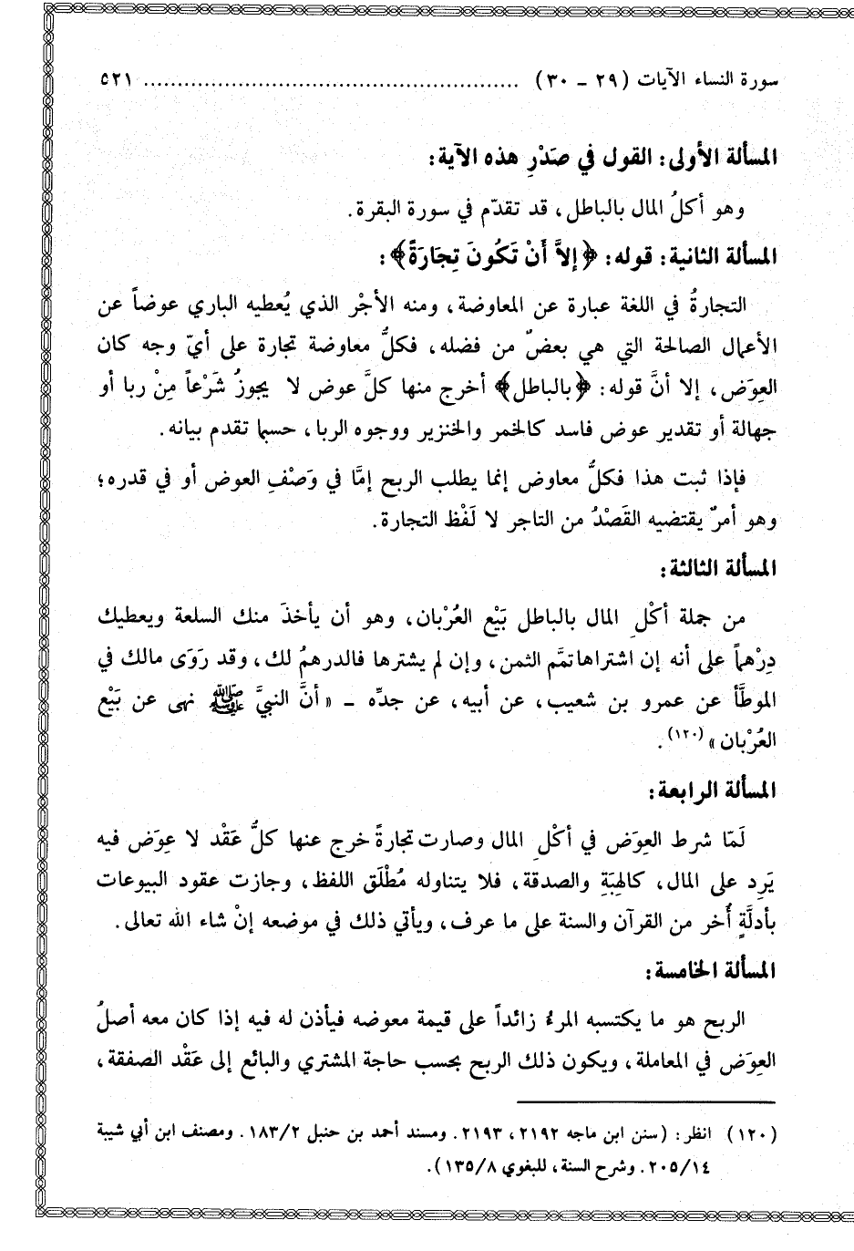 الْمَسْأَلَةُ الثَّانِيَةُ: قَوْلُهُ: {إِلا أَنْ تَكُونَ تِجَارَةً} [النساء: 29]: التِّجَارَةُ فِي اللُّغَةِ عِبَارَةٌ عَنْ الْمُعَاوَضَةِ، وَمِنْهُ الْأَجْرُ الَّذِي يُعْطِيهِ الْبَارِي عِوَضًا عَنْ الْأَعْمَالِ الصَّالِحَةِ الَّتِي هِيَ بَعْضٌ مِنْ فَضْلِهِ، فَكُلُّ مُعَاوَضَةٍ تِجَارَةٌ عَلَى أَيِّ وَجْهٍ كَانَ الْعِوَضُ، إلَّا أَنَّ قَوْلَهُ: {بِالْبَاطِلِ} [النساء: 29] أَخْرَجَ مِنْهَا كُلَّ عِوَضٍ لَا يَجُوزُ شَرْعًا مِنْ رِبًا أَوْ جَهَالَةٍ أَوْ تَقْدِيرِ عِوَضٍ فَاسِدٍ كَالْخَمْرِ وَالْخِنْزِيرِ وَوُجُوهِ الرِّبَا، حَسْبَمَا تَقَدَّمَ بَيَانُهُ. فَإِذَا ثَبَتَ هَذَا فَكُلُّ مُعَاوِضٍ إنَّمَا يَطْلُبُ الرِّبْحَ إمَّا فِي وَصْفِ الْعِوَضِ أَوْ فِي قَدْرِهِ؛ وَهُوَ أَمْرٌ يَقْتَضِيهِ الْقَصْدُ مِنْ التَّاجِرِ لَا لَفْظُ التِّجَارَةِ.