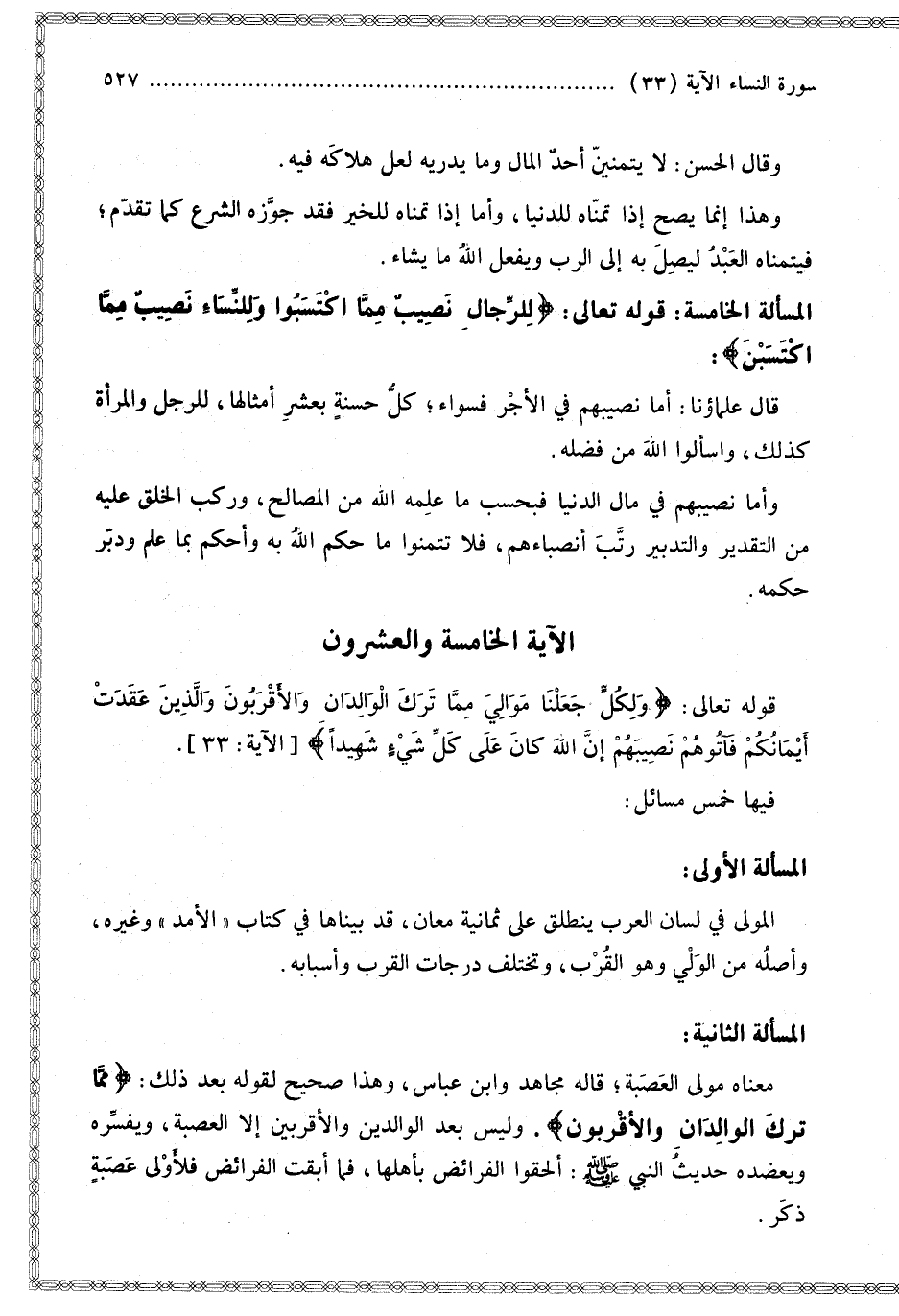 َ وَالَّذِينَ عَقَدَتْ أَيْمَانُكُمْ فَآتُوهُمْ نَصِيبَهُمْ إِنَّ اللَّهَ كَانَ عَلَى كُلِّ شَيْءٍ شَهِيدًا} [النساء: 33]. فِيهَا خَمْسُ مَسَائِلَ: