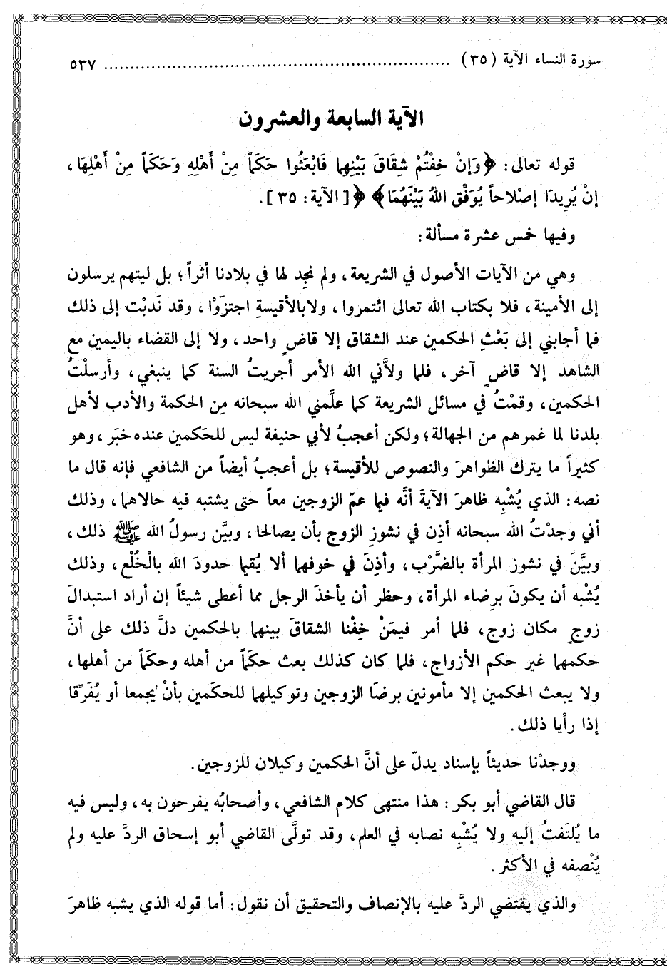 {وَإِنْ خِفْتُمْ شِقَاقَ بَيْنِهِمَا فَابْعَثُوا حَكَمًا مِنْ أَهْلِهِ وَحَكَمًا مِنْ أَهْلِهَا إِنْ يُرِيدَا إِصْلاحًا يُوَفِّقِ اللَّهُ بَيْنَهُمَا} [النساء: 35] وَفِيهَا خَمْسَ عَشْرَةَ مَسْأَلَةً: وَهِيَ مِنْ الْآيَاتِ الْأُصُولِ فِي الشَّرِيعَةِ، وَلَمْ نَجِدْ لَهَا فِي بِلَادِنَا أَثَرًا؛ بَلْ لَيْتَهُمْ يُرْسِلُونَ إلَى الْأَمِينَةِ، فَلَا بِكِتَابِ اللَّهِ تَعَالَى ائْتَمَرُوا، وَلَا بِالْأَقْيِسَةِ اجْتَزَوْا، وَقَدْ نَدَبْت إلَى ذَلِكَ فَمَا أَجَابَنِي إلَى بَعْثِ الْحَكَمَيْنِ عِنْدَ الشِّقَاقِ إلَّا قَاضٍ وَاحِدٌ، وَلَا إلَى الْقَضَاءِ بِالْيَمِينِ مَعَ الشَّاهِدِ إلَّا قَاضٍ آخَرُ، فَلَمَّا وَلَّانِي اللَّهُ الْأَمْرَ أَجْرَيْت السُّنَّةَ كَمَا يَنْبَغِي، وَأَرْسَلْت الْحَكَمَيْنِ، وَقُمْت فِي مَسَائِلِ الشَّرِيعَةِ كَمَا عَلَّمَنِي اللَّهُ سُبْحَانَهُ مِنْ الْحِكْمَةِ وَالْأَدَبِ لِأَهْلِ بَلَدِنَا لِمَا غَمَرَهُمْ مِنْ الْجَهَالَةِ؛ وَلَكِنْ أَعْجَبُ لِأَبِي حَنِيفَةَ لَيْسَ لِلْحَكَمَيْنِ عِنْدَهُ خَبَرٌ، وَهُوَ كَثِيرًا مَا يَتْرُكُ الظَّوَاهِرَ وَالنُّصُوصَ لِلْأَقْيِسَةِ؛ بَلْ أَعْجَبُ أَيْضًا مِنْ الشَّافِعِيِّ فَإِنَّهُ قَالَ مَا نَصُّهُ: الَّذِي يُشْبِهُ ظَاهِرَ الْآيَةِ أَنَّهُ فِيمَا عَمَّ الزَّوْجَيْنِ مَعًا حَتَّى يَشْتَبِهَ فِيهِ حَالَاهُمَا، وَذَلِكَ أَنِّي وَجَدْت اللَّهَ سُبْحَانَهُ أَذِنَ فِي نُشُوزِ الزَّوْجِ بِأَنْ يُصَالَحَا، وَبَيَّنَ رَسُولُ اللَّهِ - صَلَّى اللَّهُ عَلَيْهِ وَسَلَّمَ - ذَلِكَ، وَبَيَّنَ فِي نُشُوزِ الْمَرْأَةِ بِالضَّرْبِ، وَأَذِنَ فِي خَوْفِهِمَا أَلَّا يُقِيمَا حُدُودَ اللَّهِ بِالْخُلْعِ، وَذَلِكَ يُشْبِهُ أَنْ يَكُونَ بِرِضَاءِ الْمَرْأَةِ، وَحُظِرَ أَنْ يَأْخُذُ الرَّجُل مِمَّا أَعْطَى شَيْئًا إنْ أَرَادَ اسْتِبْدَالَ زَوْجٍ مَكَانَ زَوْجٍ، فَلَمَّا أَمَرَ فِيمَنْ خِفْنَا الشِّقَاقَ بَيْنَهُمَا بِالْحَكَمَيْنِ دَلَّ ذَلِكَ عَلَى أَنَّ حُكْمَهُمَا غَيْرُ حُكْمِ الْأَزْوَاجِ، فَلَمَّا كَانَ كَذَلِكَ بَعَثَ حَكَمًا مِنْ أَهْلِهِ وَحَكَمًا مِنْ أَهْلِهَا، وَلَا يَبْعَثُ الْحَكَمَيْنِ إلَّا مَأْمُونَيْنِ بِرِضَا الزَّوْجَيْنِ وَتَوْكِيلِهِمَا لِلْحَكَمَيْنِ بِأَنْ يَجْمَعَا أَوْ يُفَرِّقَا إذَا رَأَيَا ذَلِكَ.