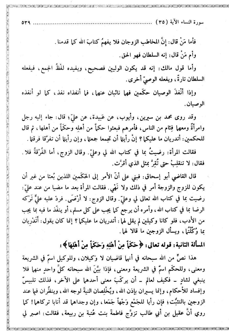 فَأَمَّا مَنْ قَالَ: إنَّ الْمُخَاطَبَ الزَّوْجَانِ فَلَا يَفْهَمُ كِتَابَ اللَّهِ كَمَا قَدَّمْنَا. وَأَمَّا مَنْ قَالَ: إنَّهُ السُّلْطَانُ فَهُوَ الْحَقُّ. وَأَمَّا قَوْلُ مَالِكٍ: إنَّهُ قَدْ يَكُونُ الْوَلِيَّيْنِ فَصَحِيحٌ، وَيُفِيدُهُ لَفْظُ الْجَمْعِ، فَيَفْعَلُهُ السُّلْطَانُ تَارَةً، وَيَفْعَلُهُ الْوَصِيُّ أُخْرَى. وَإِذَا أَنْفَذَ الْوَصِيَّانِ حَكَمَيْنِ فَهُمَا نَائِبَانِ عَنْهُمَا، فَمَا أَنْفَذَاهُ نَفَذَ، كَمَا لَوْ أَنْفَذَهُ الْوَصِيَّانِ.