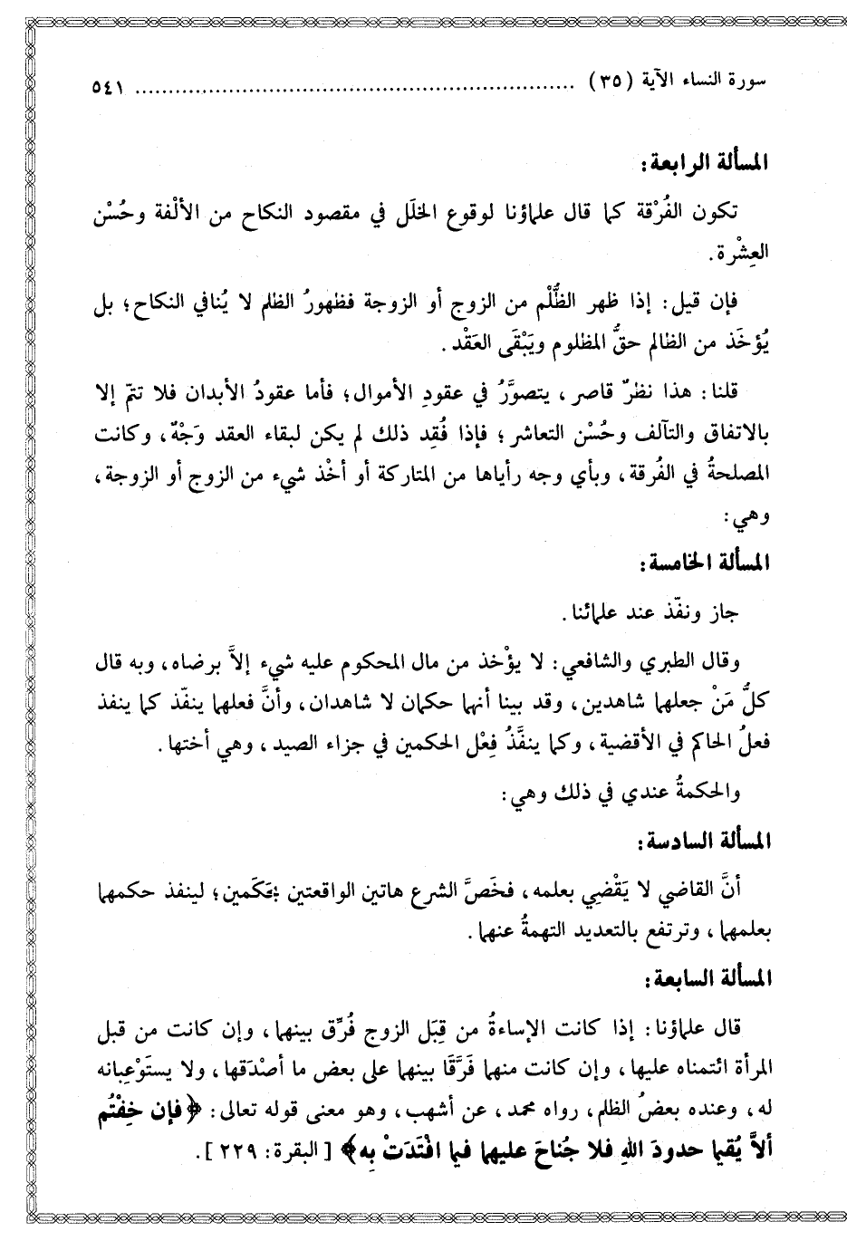 الْمَسْأَلَةُ الْخَامِسَةُ: جَازَ وَنَفَذَ عِنْدَ عُلَمَائِنَا. قَالَ الطَّبَرِيُّ وَالشَّافِعِيُّ: لَا يُؤْخَذُ مِنْ مَالِ الْمَحْكُومِ عَلَيْهِ شَيْءٌ إلَّا بِرِضَاهُ، وَبِهِ قَالَ كُلَّ مَنْ جَعَلَهُمَا شَاهِدَيْنِ، وَقَدْ بَيَّنَّا أَنَّهُمَا حَكَمَانِ لَا شَاهِدَانِ، وَأَنَّ فِعْلَهُمَا يَنْفُذُ كَمَا يَنْفُذُ فِعْلُ الْحَاكِمِ فِي الْأَقْضِيَةِ، وَكَمَا يَنْفُذُ فِعْلُ الْحَكَمَيْنِ فِي جَزَاءِ الصَّيْدِ، وَهِيَ أُخْتُهَا. وَالْحِكْمَةُ عِنْدِي فِي ذَلِكَ وَهِيَ:
