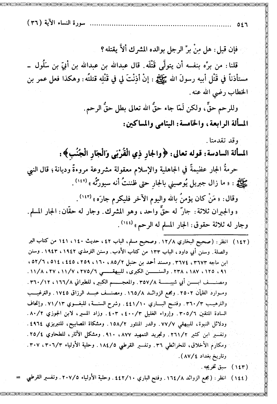 الْمَسْأَلَةُ السَّادِسَةُ: قَوْله تَعَالَى: {وَالْجَارِ ذِي الْقُرْبَى وَالْجَارِ الْجُنُبِ} [النساء: 36]: حُرْمَةُ الْجَارِ عَظِيمَةٌ فِي الْجَاهِلِيَّةِ وَالْإِسْلَامِ مَعْقُولَةٌ مَشْرُوعَةٌ مُرُوءَةً وَدِيَانَةً؛ قَالَ النَّبِيُّ - صَلَّى اللَّهُ عَلَيْهِ وَسَلَّمَ -: «مَا زَالَ جِبْرِيلُ يُوصِينِي بِالْجَارِ حَتَّى ظَنَنْت أَنَّهُ سَيُوَرِّثُهُ».