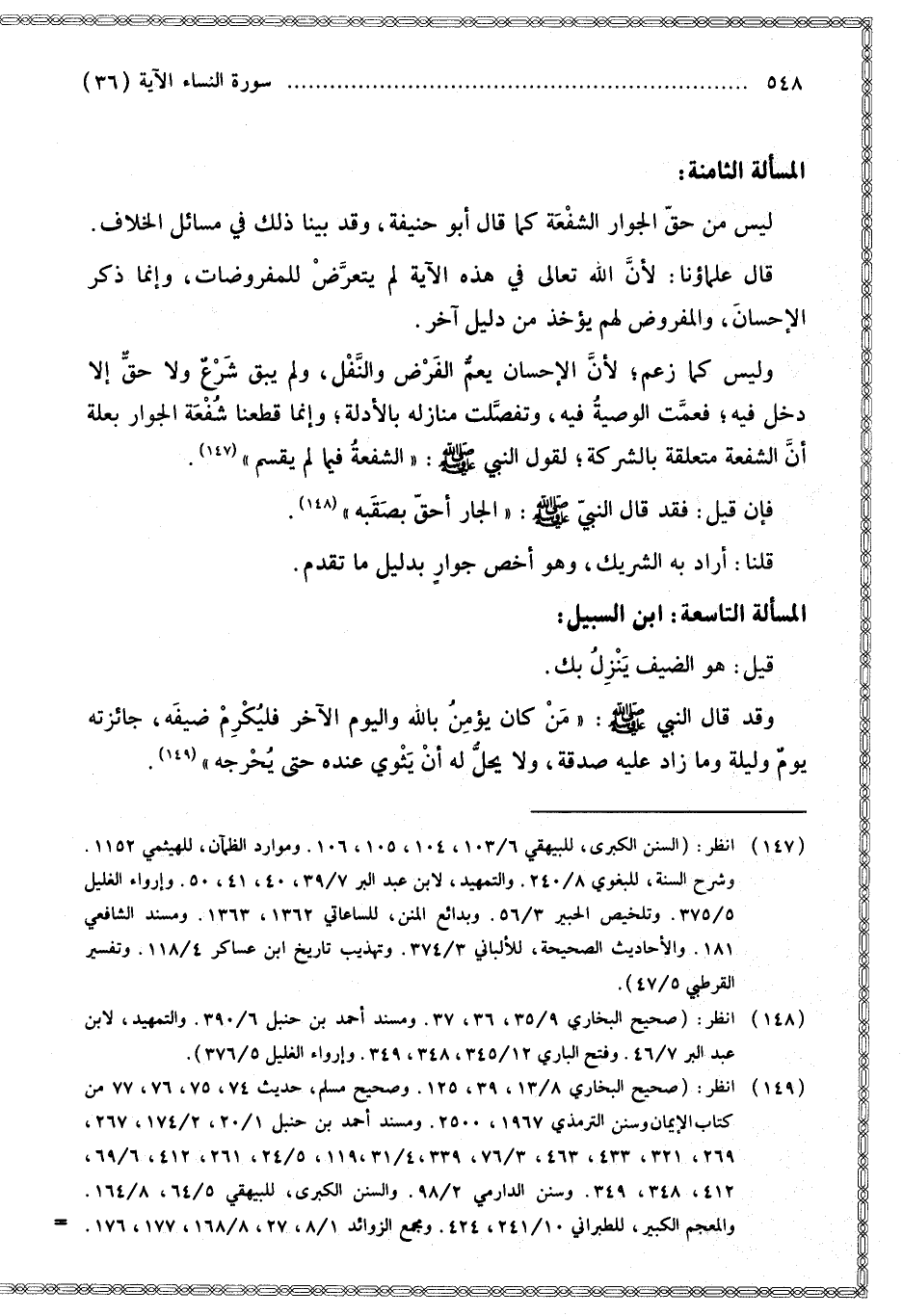 الْمَسْأَلَةُ الثَّامِنَةُ: لَيْسَ مِنْ حَقِّ الْجُوَارِ الشُّفْعَةُ كَمَا قَالَ أَبُو حَنِيفَةَ، وَقَدْ بَيَّنَّا ذَلِكَ فِي مَسَائِلِ الْخِلَافِ. قَالَ عُلَمَاؤُنَا: لِأَنَّ اللَّهَ تَعَالَى فِي هَذِهِ الْآيَةِ لَمْ يَتَعَرَّضْ لِلْمَفْرُوضَاتِ، وَإِنَّمَا ذَكَرَ الْإِحْسَانَ، وَالْمَفْرُوضُ لَهُمْ يُؤْخَذُ مِنْ دَلِيلٍ آخَرَ. وَلَيْسَ كَمَا زَعَمَ؛ لِأَنَّ الْإِحْسَانَ يَعُمُّ الْفَرْضَ وَالنَّفَلَ، وَلَمْ يَبْقَ شَرْعٌ وَلَا حَقٌّ إلَّا دَخَلَ فِيهِ؛ فَعَمَّتْ الْوَصِيَّةُ فِيهِ، وَتَفَصَّلَتْ مَنَازِلُهُ بِالْأَدِلَّةِ؛ وَإِنَّمَا قَطَعْنَا شُفْعَةَ الْجِوَارِ بِعِلَّةٍ أَنَّ الشُّفْعَةَ مُتَعَلِّقَةٌ بِالشَّرِكَةِ؛ لِقَوْلِ النَّبِيِّ - صَلَّى اللَّهُ عَلَيْهِ وَسَلَّمَ -: «الشُّفْعَةُ فِيمَا لَمْ يُقْسَمْ». فَإِنْ قِيلَ: فَقَدْ قَالَ النَّبِيُّ - صَلَّى اللَّهُ عَلَيْهِ وَسَلَّمَ -: «الْجَارُ أَحَقُّ بِصَقَبِهِ». قُلْنَا: أَرَادَ بِهِ الشَّرِيكَ، وَهُوَ أَخَصُّ جُوَارٍ بِدَلِيلِ مَا تَقَدَّمَ.