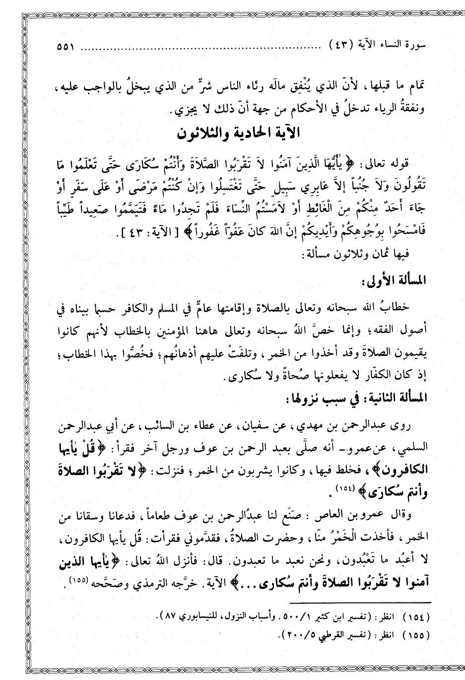 الْمَسْأَلَةُ الثَّانِيَةُ: فِي سَبَبِ نُزُولِهَا: رَوَى عَبْدُ الرَّحْمَنِ بْنُ مَهْدِيٍّ عَنْ سُفْيَانَ عَنْ عَطَاءِ بْنِ السَّائِبِ عَنْ أَبِي عَبْدِ الرَّحْمَنِ السُّلَمِيِّ، عَنْ [عَلِيٍّ] (*) أَنَّهُ صَلَّى بِعَبْدِ الرَّحْمَنِ بْنِ عَوْفٍ وَرَجُلٍ آخَرَ فَقَرَأَ: {قُلْ يَا أَيُّهَا الْكَافِرُونَ} [الكافرون: 1] فَخَلَطَ فِيهَا، وَكَانُوا يَشْرَبُونَ مِنْ الْخَمْرِ؛ فَنَزَلَتْ: {لا تَقْرَبُوا الصَّلاةَ وَأَنْتُمْ سُكَارَى} [النساء: 43].