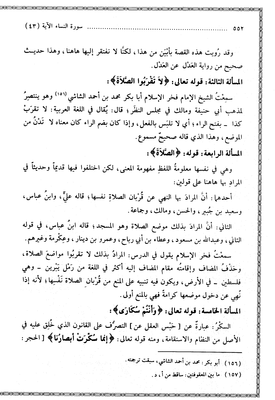 الْمَسْأَلَةُ الثَّالِثَةُ: قَوْله تَعَالَى: {لا تَقْرَبُوا الصَّلاةَ} [النساء: 43]: سَمِعْت الشَّيْخَ الْإِمَامَ فَخْرَ الْإِسْلَامِ أَبَا بَكْرٍ مُحَمَّدَ بْنَ أَحْمَدَ الشَّاشِيَّ وَهُوَ يَنْتَصِرُ لِمَذْهَبِ أَبِي حَنِيفَةَ وَمَالِكٍ فِي مَجْلِسِ النَّظَرِ؛ قَالَ: يُقَالُ فِي اللُّغَةِ الْعَرَبِيَّةِ: لَا تَقْرَبْ كَذَا بِفَتْحِ الرَّاءِ أَيْ لَا تَلْبَسْ بِالْفِعْلِ، وَإِذَا كَانَ بِضَمِّ الرَّاءِ كَانَ مَعْنَاهُ لَا تَدْنُ مِنْ الْمَوْضِعِ، وَهَذَا الَّذِي قَالَهُ صَحِيحٌ مَسْمُوعٌ.