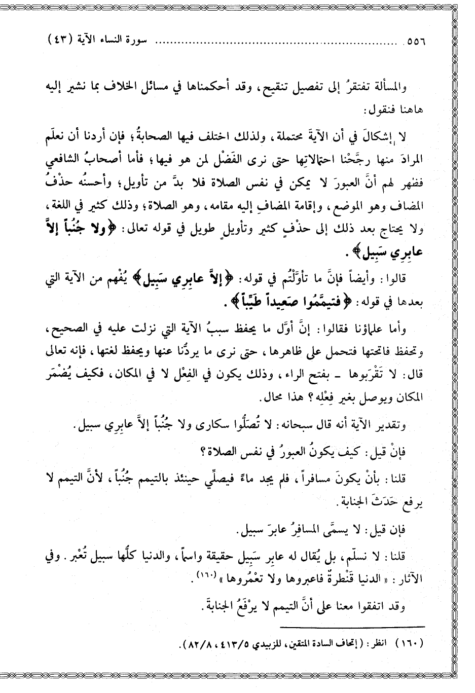 والْمَسْأَلَةُ تَفْتَقِرُ إلَى تَفْصِيلٍ وَتَنْقِيحٍ، وَقَدْ أَحْكَمْنَاهَا فِي مَسَائِلِ الْخِلَافِ بِمَا نُشِيرُ إلَيْهِ هَاهُنَا فَنَقُولُ: لَا إشْكَالَ فِي أَنَّ الْآيَةَ مُحْتَمَلَةٌ، وَلِذَلِكَ اخْتَلَفَ فِيهَا الصَّحَابَةُ؛ فَإِنْ أَرَدْنَا أَنْ نَعْلَمَ الْمُرَادَ مِنْهَا رَجَّحْنَا احْتِمَالَاتِهَا حَتَّى نَرَى الْفَضْلَ لِمَنْ هُوَ فِيهَا؛ فَأَمَّا أَصْحَابُ الشَّافِعِيِّ فَظَهَرَ لَهُمْ أَنَّ الْعُبُورَ لَا يُمْكِنُ فِي نَفْسِ الصَّلَاةِ فَلَا بُدَّ مِنْ تَأْوِيلٍ؛ وَأَحْسَنُهُ حَذْفُ الْمُضَافِ وَهُوَ الْمَوْضِعُ، وَإِقَامَةُ الْمُضَافِ إلَيْهِ مَقَامَهُ، وَهُوَ الصَّلَاةُ؛ وَذَلِكَ كَثِيرٌ فِي اللُّغَةِ، وَلَا يَحْتَاجُ بَعْدَ ذَلِكَ إلَى حَذْفٍ كَثِيرٍ وَتَأْوِيلٍ طَوِيلٍ فِي قَوْله تَعَالَى: {وَلا جُنُبًا إِلا عَابِرِي سَبِيلٍ} [النساء: 43].
