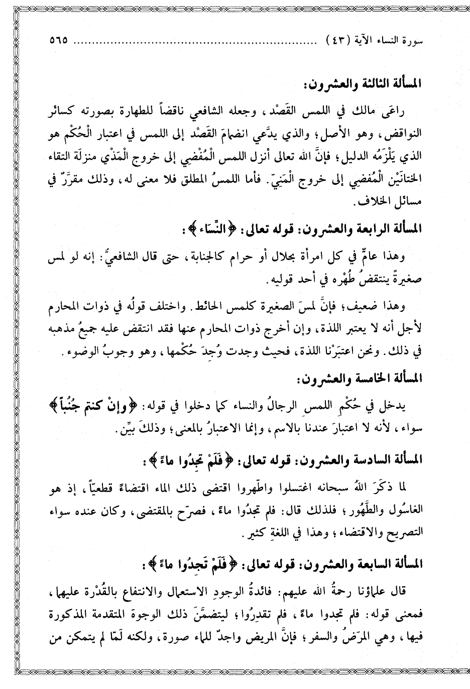الْمَسْأَلَةُ الرَّابِعَةُ وَالْعِشْرُونَ: قَوْله تَعَالَى: {النِّسَاءَ} [النساء: 43]: وَهَذَا عَامٌّ فِي كُلِّ امْرَأَةٍ بِحَلَالٍ أَوْ حَرَامٍ كَالْجَنَابَةِ، حَتَّى قَالَ الشَّافِعِيُّ: إنَّهُ لَوْ لَمَسَ صَغِيرَةً يُنْتَقَضُ طُهْرُهُ فِي أَحَدِ قَوْلَيْهِ. وَهَذَا ضَعِيفٌ؛ فَإِنَّ لَمْسَ الصَّغِيرَةِ كَلَمْسِ الْحَائِضِ. وَاخْتَلَفَ قَوْلُهُ فِي ذَوَاتِ الْمَحَارِمِ لِأَجْلِ أَنَّهُ لَا يَعْتَبِرُ اللَّذَّةَ، وَإِنْ أَخْرَجَ ذَوَاتَ الْمَحَارِمِ عَنْهَا فَقَدْ اُنْتُقِضَ عَلَيْهِ جَمِيعُ مَذْهَبِهِ فِي ذَلِكَ. وَنَحْنُ اعْتَبَرْنَا اللَّذَّةَ، فَحَيْثُ وُجِدَتْ وُجِدَ حُكْمُهَا، وَهُوَ وُجُوبُ الْوُضُوءِ.