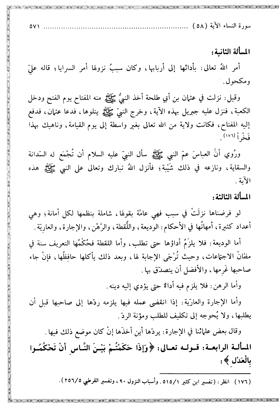الْمَسْأَلَةُ الثَّانِيَةُ: أَمَرَ اللَّهُ تَعَالَى: بِأَدَائِهَا إلَى أَرْبَابِهَا، وَكَانَ سَبَبُ نُزُولِهَا أَمْرُ السَّرَايَا؛ قَالَهُ عَلِيٌّ وَمَكْحُولٌ. وَقِيلَ: نَزَلَتْ فِي «عُثْمَانَ بْنِ أَبِي طَلْحَةَ أَخَذَ النَّبِيُّ - صَلَّى اللَّهُ عَلَيْهِ وَسَلَّمَ - مِنْهُ الْمِفْتَاحَ يَوْمَ الْفَتْحِ وَدَخَلَ الْكَعْبَةَ، فَنَزَلَ عَلَيْهِ جِبْرِيلُ بِهَذِهِ الْآيَةِ، وَخَرَجَ النَّبِيُّ - صَلَّى اللَّهُ عَلَيْهِ وَسَلَّمَ - يَتْلُوهَا، فَدَعَا عُثْمَانُ، فَدَفَعَ إلَيْهِ الْمِفْتَاحَ»، فَكَانَتْ وِلَايَةٌ مِنْ اللَّهِ تَعَالَى بِغَيْرِ وَاسِطَةٍ إلَى يَوْمِ الْقِيَامَةِ، وَنَاهِيكَ بِهَذَا فَخْرًا. وَرُوِيَ أَنَّ الْعَبَّاسَ عَمَّ النَّبِيِّ - صَلَّى اللَّهُ عَلَيْهِ وَسَلَّمَ - سَأَلَ النَّبِيَّ - عَلَيْهِ السَّلَامُ - أَنْ تُجْمَعَ لَهُ السَّدَانَةُ وَالسِّقَايَةُ، وَنَازَعَهُ فِي ذَلِكَ شَيْبَةُ؛ فَأَنْزَلَ اللَّهُ تَبَارَكَ وَتَعَالَى عَلَى النَّبِيِّ - صَلَّى اللَّهُ عَلَيْهِ وَسَلَّمَ - هَذِهِ الْآيَةَ.