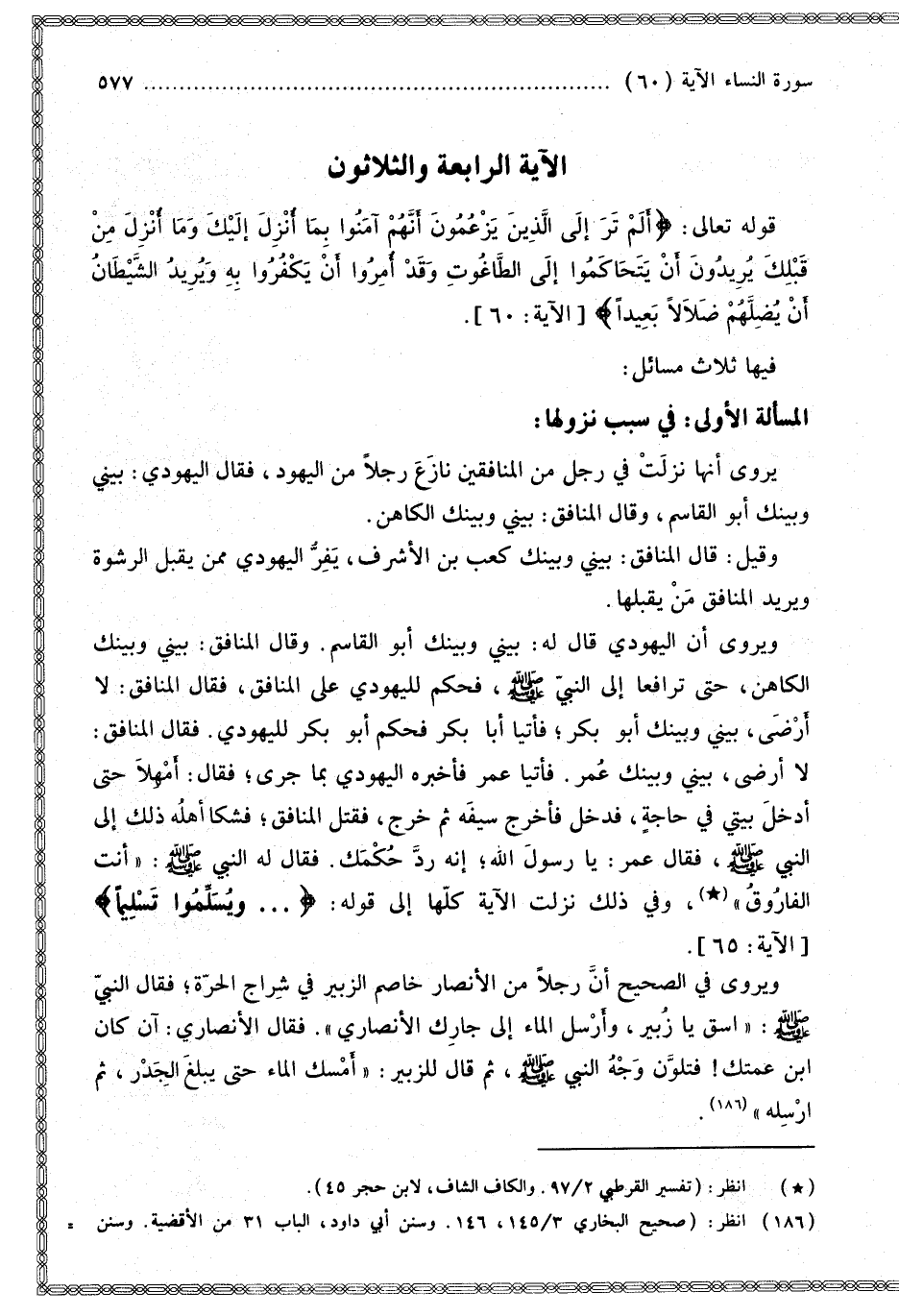 الْمَسْأَلَةُ الْأُولَى: فِي سَبَبِ نُزُولِهَا: يُرْوَى أَنَّهَا نَزَلَتْ فِي «رَجُلٍ مِنْ الْمُنَافِقِينَ نَازَعَ رَجُلًا مِنْ الْيَهُودِ، فَقَالَ الْيَهُودِيُّ: بَيْنِي وَبَيْنَكَ أَبُو الْقَاسِمِ، وَقَالَ الْمُنَافِقُ: بَيْنِي وَبَيْنَكَ الْكَاهِنُ. وَقِيلَ: قَالَ الْمُنَافِقُ: بَيْنِي وَبَيْنَكَ كَعْبُ بْنُ الْأَشْرَفِ، يَفِرُّ الْيَهُودِيُّ مِمَّنْ يَقْبَلُ الرِّشْوَةَ وَيُرِيدُ الْمُنَافِقُ مَنْ يَقْبَلُهَا. وَيُرْوَى أَنَّ الْيَهُودِيَّ قَالَ لَهُ: بَيْنِي وَبَيْنَكَ أَبُو الْقَاسِمِ. وَقَالَ الْمُنَافِقُ: بَيْنِي وَبَيْنَكَ الْكَاهِنُ، حَتَّى تَرَافَعَا إلَى النَّبِيِّ - صَلَّى اللَّهُ عَلَيْهِ وَسَلَّمَ - فَحَكَمَ لِلْيَهُودِيِّ عَلَى الْمُنَافِقِ، فَقَالَ الْمُنَافِقُ: لَا أَرْضَى، بَيْنِي وَبَيْنَكَ أَبُو بَكْرٍ؛ فَأَتَيَا أَبَا بَكْرٍ فَحَكَمَ أَبُو بَكْرٍ لِلْيَهُودِيِّ. فَقَالَ الْمُنَافِقُ: لَا أَرْضَى، بَيْنِي وَبَيْنَكَ عُمَرُ. فَأَتَيَا عُمَرَ فَأَخْبَرَهُ الْيَهُودِيُّ بِمَا جَرَى؛ فَقَالَ: أَمْهِلَا حَتَّى أَدْخُلَ بَيْتِي فِي حَاجَةٍ، فَدَخَلَ فَأَخْرَجَ سَيْفَهُ ثُمَّ خَرَجَ، فَقَتَلَ الْمُنَافِقَ؛ فَشَكَا أَهْلُهُ ذَلِكَ إلَى النَّبِيِّ - صَلَّى اللَّهُ عَلَيْهِ وَسَلَّمَ - فَقَالَ عُمَرُ: يَا رَسُولَ اللَّهِ؛ إنَّهُ رَدَّ حُكْمَكَ. فَقَالَ لَهُ النَّبِيُّ - صَلَّى اللَّهُ عَلَيْهِ وَسَلَّمَ -: أَنْتَ الْفَارُوقُ»، وَفِي ذَلِكَ نَزَلَتْ الْآيَةُ كُلُّهَا إلَى قَوْلِهِ: {وَيُسَلِّمُوا تَسْلِيمًا} [النساء: 65]. وَيُرْوَى فِي الصَّحِيحِ أَنَّ «رَجُلًا مِنْ الْأَنْصَارِ خَاصَمَ الزُّبَيْرَ فِي شِرَاجِ الْحُرَّةِ؛ فَقَالَ النَّبِيُّ - صَلَّى اللَّهُ عَلَيْهِ وَسَلَّمَ -: اسْقِ يَا زُبَيْرُ، وَأَرْسِلْ الْمَاءَ إلَى جَارِكِ الْأَنْصَارِيِّ. فَقَالَ الْأَنْصَارِيُّ: آنَ كَانَ ابْنَ عَمَّتِكَ، فَتَلَوَّنَ وَجْهُ النَّبِيِّ - صَلَّى اللَّهُ عَلَيْهِ وَسَلَّمَ - ثُمَّ قَالَ لِلزُّبَيْرِ: أَمْسِكْ الْمَاءَ حَتَّى يَبْلُغَ الْجَدْرَ، ثُمَّ أَرْسِلْهُ».