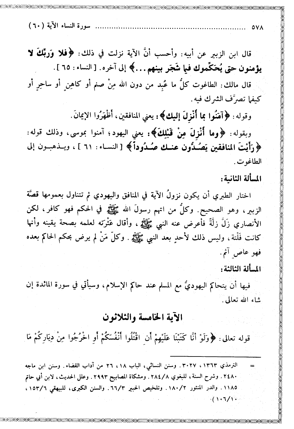 الْمَسْأَلَةُ الثَّانِيَةُ: اخْتَارَ الطَّبَرِيُّ أَنْ يَكُونَ نُزُولُ الْآيَةِ فِي الْمُنَافِقِ وَالْيَهُودِيِّ ثُمَّ تَتَنَاوَلُ بِعُمُومِهَا قِصَّةَ الزُّبَيْرِ، وَهُوَ الصَّحِيحُ. وَكُلُّ مَنْ اتَّهَمَ رَسُولَ اللَّهِ - صَلَّى اللَّهُ عَلَيْهِ وَسَلَّمَ - فِي الْحُكْمِ فَهُوَ كَافِرٌ، لَكِنَّ الْأَنْصَارِيَّ زَلَّ زَلَّةً فَأَعْرَضَ عَنْهُ النَّبِيُّ - صَلَّى اللَّهُ عَلَيْهِ وَسَلَّمَ - وَأَقَالَ عَثْرَتَهُ لِعِلْمِهِ بِصِحَّةِ يَقِينِهِ وَأَنَّهَا كَانَتْ فَلْتَةً، وَلَيْسَ ذَلِكَ لِأَحَدٍ بَعْدَ النَّبِيِّ - صَلَّى اللَّهُ عَلَيْهِ وَسَلَّمَ - وَكُلُّ مَنْ لَمْ يَرْضَ بِحُكْمِ الْحَاكِمِ بَعْدَهُ فَهُوَ عَاصٍ آثِمٌ.