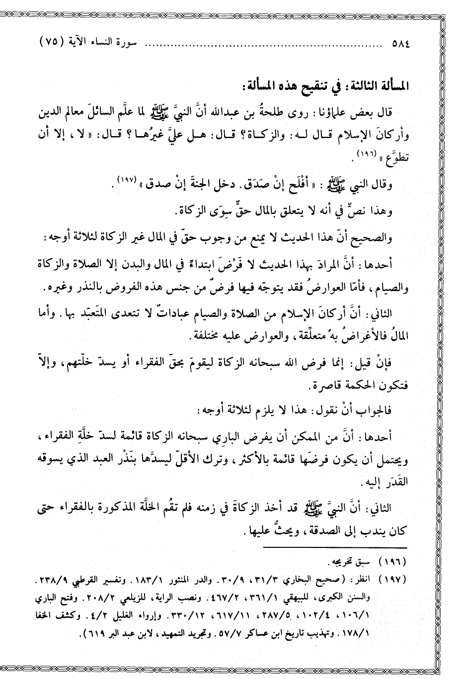 الْمَسْأَلَةُ الثَّالِثَةُ: فِي تَنْقِيحِ هَذِهِ الْمَسْأَلَةِ: قَالَ بَعْضُ عُلَمَاؤُنَا: رَوَى طَلْحَةُ بْنُ عَبْدِ اللَّهِ أَنَّ «النَّبِيَّ - صَلَّى اللَّهُ عَلَيْهِ وَسَلَّمَ - لَمَّا عَلَّمَ السَّائِلَ مَعَالِمَ الدِّينِ وَأَرْكَانِ الْإِسْلَامِ قَالَ لَهُ: وَالزَّكَاةُ؟ قَالَ: هَلْ عَلَيَّ غَيْرُهَا؟ قَالَ: لَا، إلَّا أَنْ تَطَوَّعَ». وَقَالَ النَّبِيُّ - صَلَّى اللَّهُ عَلَيْهِ وَسَلَّمَ -: «أَفْلَحَ إنْ صَدَقَ. دَخَلَ الْجَنَّةَ إنْ صَدَقَ». وَهَذَا نَصٌّ فِي أَنَّهُ لَا يَتَعَلَّقُ بِالْمَالِ حَقٌّ سِوَى الزَّكَاةِ.