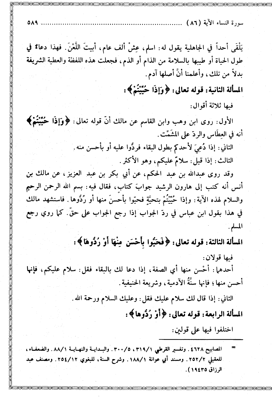 الْمَسْأَلَةُ الثَّانِيَةُ: قَوْله تَعَالَى: {وَإِذَا حُيِّيتُمْ} [النساء: 86]: فِيهَا ثَلَاثَةُ أَقْوَالٍ: