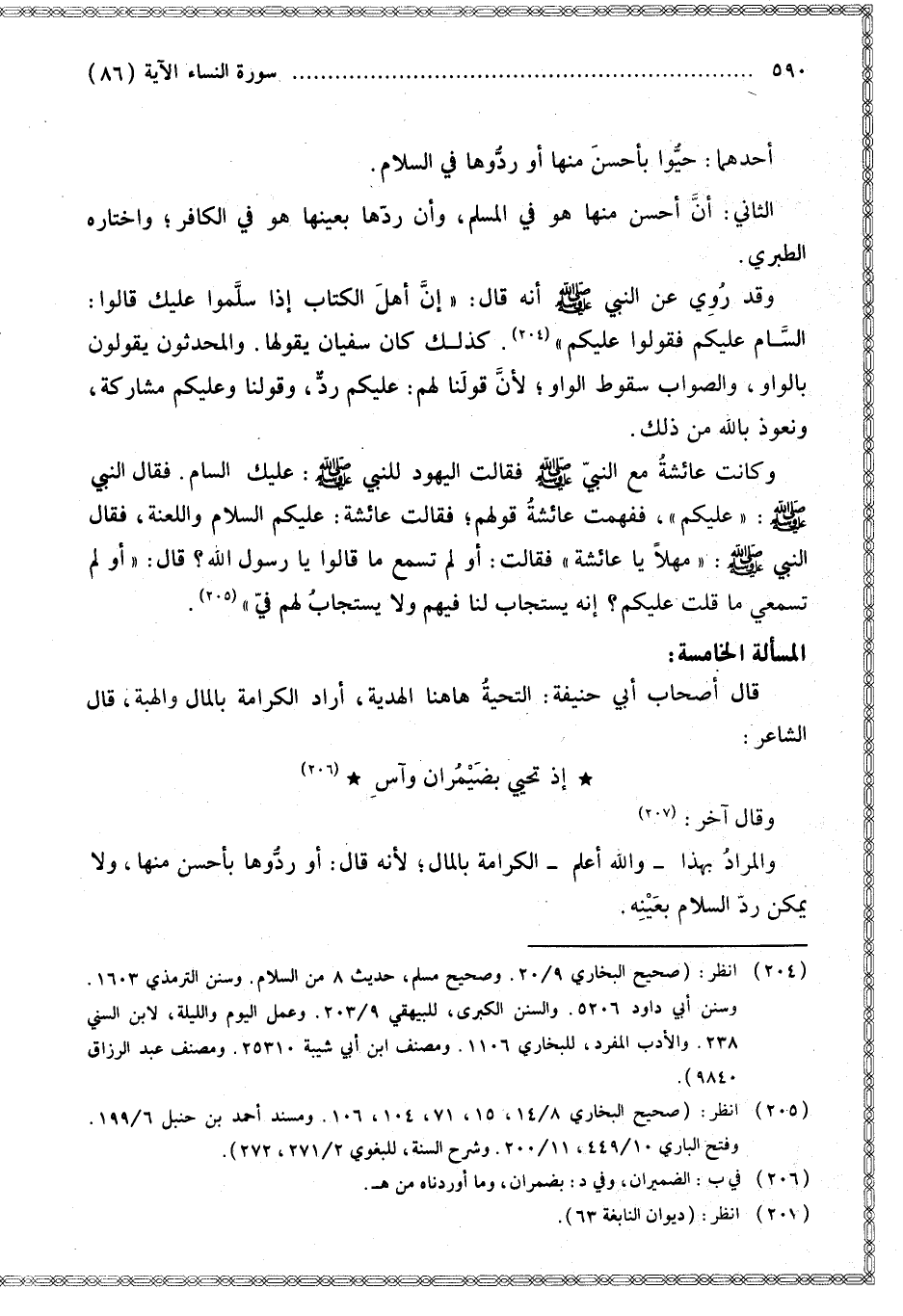 الثَّانِي: أَنَّ أَحْسَنَ مِنْهَا هُوَ فِي الْمُسْلِمِ، وَأَنَّ رُدَّهَا بِعَيْنِهَا هُوَ فِي الْكَافِرِ؛ وَاخْتَارَهُ الطَّبَرِيُّ. وَقَدْ رُوِيَ عَنْ النَّبِيِّ - صَلَّى اللَّهُ عَلَيْهِ وَسَلَّمَ - أَنَّهُ قَالَ: «إنَّ أَهْلَ الْكِتَابِ إذَا سَلَّمُوا عَلَيْك قَالُوا: السَّامُّ عَلَيْكُمْ فَقُولُوا عَلَيْكُمْ». كَذَلِكَ كَانَ سُفْيَانُ يَقُولُهَا. وَالْمُحْدَثُونَ يَقُولُونَ بِالْوَاوِ، وَالصَّوَابُ سُقُوطُ الْوَاوِ؛ لِأَنَّ قَوْلَنَا لَهُمْ: عَلَيْكُمْ رَدٌّ، وَقَوْلَنَا وَعَلَيْكُمْ مُشَارَكَةٌ، وَنَعُوذُ بِاَللَّهِ مِنْ ذَلِكَ. «وَكَانَتْ عَائِشَةُ مَعَ النَّبِيِّ - صَلَّى اللَّهُ عَلَيْهِ وَسَلَّمَ - فَقَالَتْ الْيَهُودُ لِلنَّبِيِّ - صَلَّى اللَّهُ عَلَيْهِ وَسَلَّمَ -: عَلَيْك السَّامُّ. فَقَالَ النَّبِيُّ - صَلَّى اللَّهُ عَلَيْهِ وَسَلَّمَ -: عَلَيْكُمْ فَفَهِمَتْ عَائِشَةُ قَوْلَهُمْ؛ فَقَالَتْ عَائِشَةُ: عَلَيْكُمْ السَّامُ وَاللَّعْنَةُ، فَقَالَ النَّبِيُّ - صَلَّى اللَّهُ عَلَيْهِ وَسَلَّمَ - مَهْلًا يَا عَائِشَةُ فَقَالَتْ: أَوَلَمْ تَسْمَعْ مَا قَالُوا يَا رَسُولَ اللَّهِ؟ قَالَ: أَوَ لَمْ تَسْمَعِي مَا قُلْت عَلَيْكُمْ؟ إنَّهُ يُسْتَجَابُ لَنَا فِيهِمْ وَلَا يُسْتَجَابُ لَهُمْ فِي».