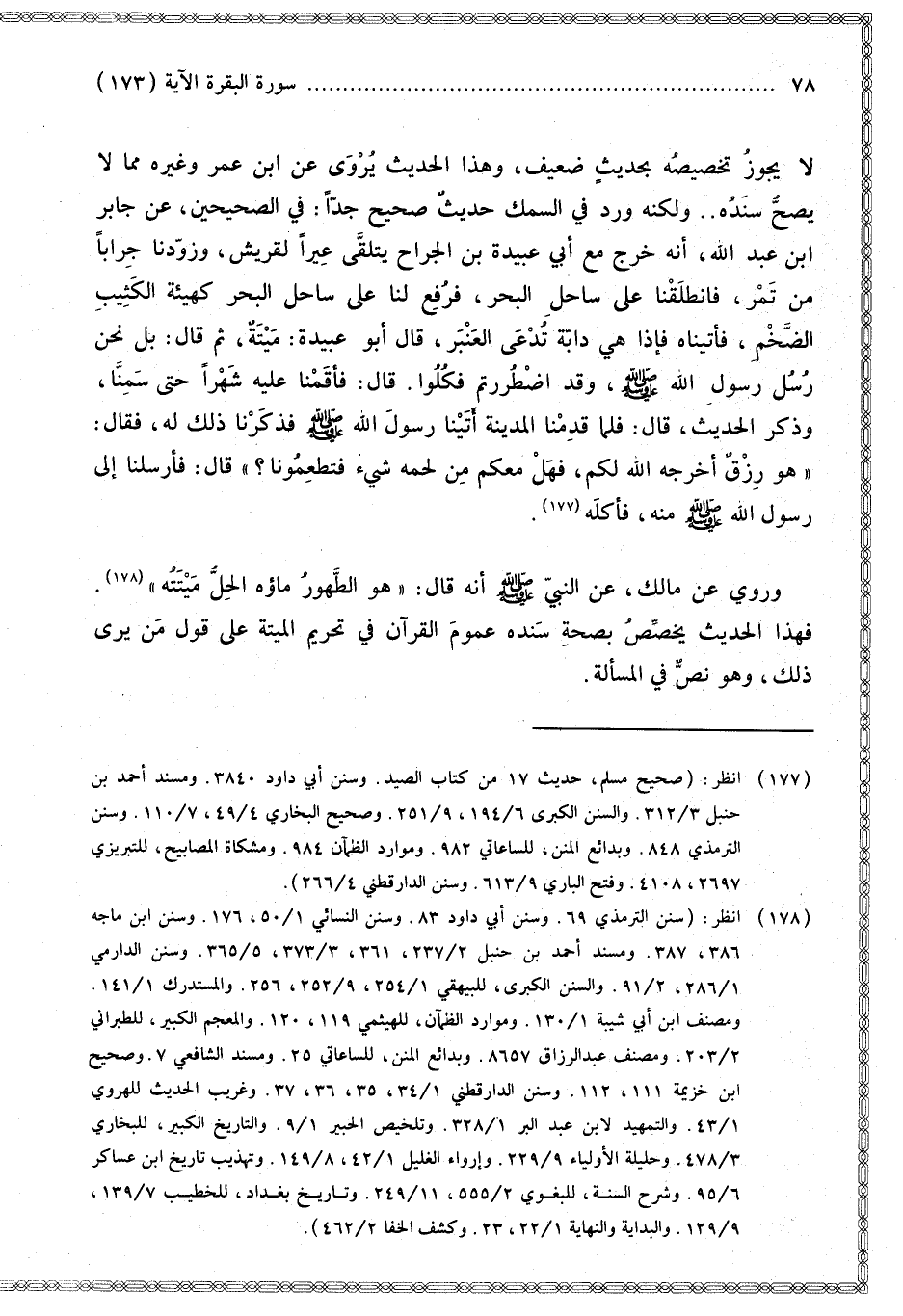 لَا يَجُوزُ تَخْصِيصُهُ بِحَدِيثٍ ضَعِيفٍ، وَهَذَا الْحَدِيثُ يُرْوَى عَنْ ابْنِ عُمَرَ وَغَيْرِهِ مِمَّا لَا يَصِحُّ سَنَدُهُ. وَلَكِنَّهُ وَرَدَ فِي السَّمَكِ حَدِيثٌ صَحِيحٌ جِدًّا: فِي الصَّحِيحَيْنِ «عَنْ جَابِرِ بْنِ عَبْدِ اللَّهِ أَنَّهُ خَرَجَ مَعَ أَبِي عُبَيْدَةَ بْنِ الْجَرَّاحِ يَتَلَقَّى عِيرًا لِقُرَيْشٍ، وَزَوَّدَنَا جِرَابًا مِنْ تَمْرٍ، فَانْطَلَقْنَا عَلَى سَاحِلِ الْبَحْرِ، فَرُفِعَ لَنَا عَلَى سَاحِلِ الْبَحْرِ كَهَيْئَةِ الْكَثِيبِ الضَّخْمِ، فَأَتَيْنَاهُ فَإِذَا هِيَ دَابَّةٌ تُدْعَى الْعَنْبَرُ قَالَ أَبُو عُبَيْدَةَ: مَيْتَةٌ، ثُمَّ قَالَ: بَلْ نَحْنُ رُسُلُ رَسُولِ اللَّهِ - صَلَّى اللَّهُ عَلَيْهِ وَسَلَّمَ - وَقَدْ اُضْطُرِرْتُمْ فَكُلُوا. قَالَ: فَأَقَمْنَا عَلَيْهِ شَهْرًا حَتَّى سَمِنَّا، وَذَكَرَ الْحَدِيثَ قَالَ: فَلَمَّا قَدِمْنَا الْمَدِينَةَ أَتَيْنَا رَسُولَ اللَّهِ - صَلَّى اللَّهُ عَلَيْهِ وَسَلَّمَ - فَذَكَرْنَا ذَلِكَ لَهُ، فَقَالَ: هُوَ رِزْقٌ أَخْرَجَهُ اللَّهُ لَكُمْ، فَهَلْ مَعَكُمْ مِنْ لَحْمِهِ شَيْءٌ فَتُطْعِمُونَا؟ قَالَ: فَأَرْسَلْنَا إلَى رَسُولِ اللَّهِ - صَلَّى اللَّهُ عَلَيْهِ وَسَلَّمَ - مِنْهُ، فَأَكَلَهُ».