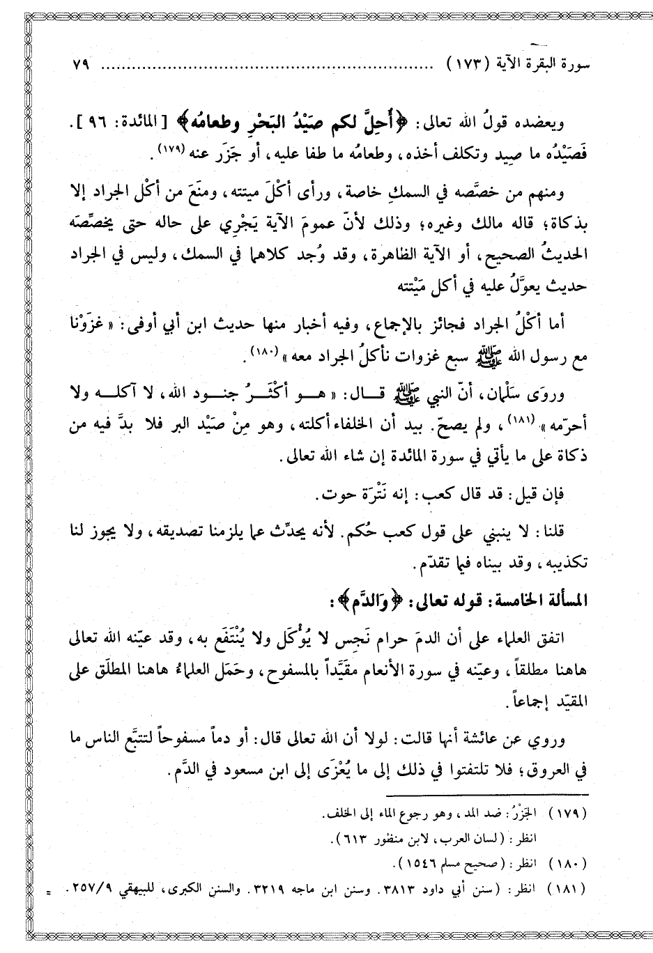 الْمَسْأَلَةُ الْخَامِسَةُ: قَوْله تَعَالَى: {وَالدَّمَ} [البقرة: 173]: اتَّفَقَ الْعُلَمَاءُ عَلَى أَنَّ الدَّمَ حَرَامٌ نَجِسٌ لَا يُؤْكَلُ وَلَا يُنْتَفَعُ بِهِ، وَقَدْ عَيَّنَهُ اللَّهُ تَعَالَى هَاهُنَا مُطْلَقًا، وَعَيَّنَهُ فِي سُورَةِ الْأَنْعَامِ مُقَيَّدًا بِالْمَسْفُوحِ، وَحَمَلَ الْعُلَمَاءُ هَاهُنَا الْمُطْلَقَ عَلَى الْمُقَيَّدِ إجْمَاعًا.