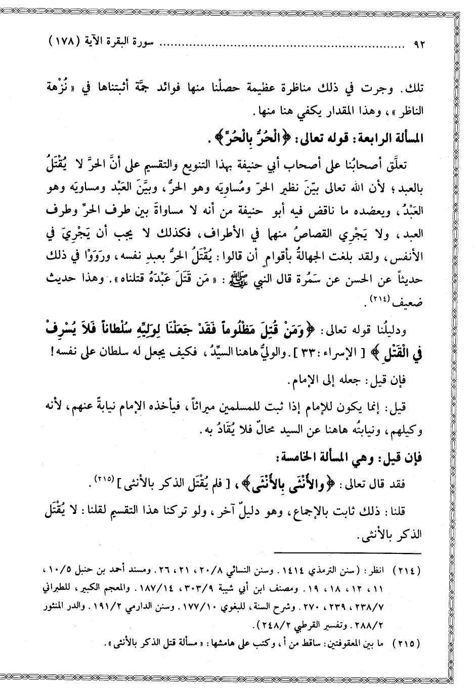 الْمَسْأَلَةُ الرَّابِعَةُ قَوْله تَعَالَى: {الْحُرُّ بِالْحُرِّ} [البقرة: 178] تَعَلَّقَ أَصْحَابُنَا عَلَى أَصْحَابِ أَبِي حَنِيفَةَ بِهَذَا التَّنْوِيعِ وَالتَّقْسِيمِ عَلَى أَنَّ الْحُرَّ لَا يُقْتَلُ بِالْعَبْدِ؛ لِأَنَّ اللَّهَ تَعَالَى بَيَّنَ نَظِيرَ الْحُرِّ وَمُسَاوِيهِ وَهُوَ الْحُرُّ، وَبَيَّنَ الْعَبْدَ وَمُسَاوِيهِ، وَهُوَ الْعَبْدُ، وَيَعْضُدُهُ مَا نَاقَضَ فِيهِ أَبُو حَنِيفَةَ مِنْ أَنَّهُ لَا مُسَاوَاةَ بَيْنَ طَرْفِ الْحُرِّ وَطَرْفِ الْعَبْدِ، وَلَا يَجْرِي الْقِصَاصُ مِنْهُمَا فِي الْأَطْرَافِ، فَكَذَلِكَ لَا يَجِبُ أَنْ يَجْرِيَ فِي الْأَنْفُسِ، وَلَقَدْ بَلَغَتْ الْجَهَالَةُ بِأَقْوَامٍ أَنْ قَالُوا: يُقْتَلُ الْحُرُّ بِعَبْدِ نَفْسِهِ، وَرَوَوْا فِي ذَلِكَ حَدِيثًا عَنْ الْحَسَنِ عَنْ سَمُرَةَ قَالَ النَّبِيُّ - صَلَّى اللَّهُ عَلَيْهِ وَسَلَّمَ -: «مَنْ قَتَلَ عَبْدَهُ قَتَلْنَاهُ» وَهَذَا حَدِيثٌ ضَعِيفٌ.