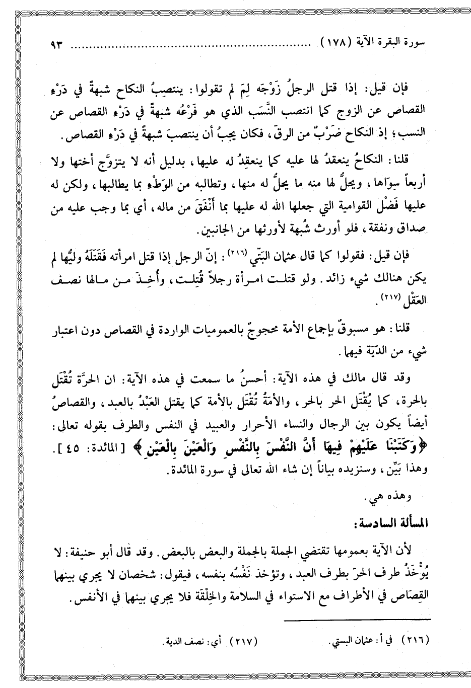 وَهَذِهِ هِيَ الْمَسْأَلَةُ السَّادِسَةُ: لِأَنَّ الْآيَةَ بِعُمُومِهَا تَقْتَضِي الْجُمْلَةَ بِالْجُمْلَةِ وَالْبَعْضَ بِالْبَعْضِ وَقَدْ قَالَ أَبُو حَنِيفَةَ: لَا يُؤْخَذُ طَرْفُ الْحُرِّ بِطَرْفِ الْعَبْدِ، وَتُؤْخَذُ نَفْسُهُ بِنَفْسِهِ، فَيَقُولُ: شَخْصَانِ لَا يَجْرِي بَيْنَهُمَا الْقِصَاصُ فِي الْأَطْرَافِ مَعَ الِاسْتِوَاءِ فِي السَّلَامَةِ وَالْخِلْقَةِ فَلَا يَجْرِي بَيْنَهُمَا فِي الْأَنْفُسِ.