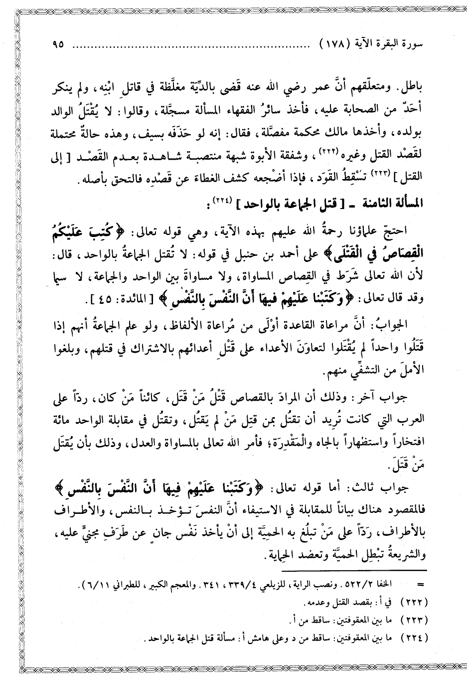 الْمَسْأَلَةُ الثَّامِنَةُ [قَتْلُ الْجَمَاعَةِ بِالْوَاحِدِ]: احْتَجَّ عُلَمَاؤُنَا رَحْمَةُ اللَّهِ عَلَيْهِمْ بِهَذِهِ الْآيَةِ، وَهِيَ قَوْله تَعَالَى: {كُتِبَ عَلَيْكُمُ الْقِصَاصُ فِي الْقَتْلَى} [البقرة: 178] عَلَى أَحْمَدَ بْنِ حَنْبَلٍ فِي قَوْلِهِ: لَا تُقْتَلُ الْجَمَاعَةُ بِالْوَاحِدِ قَالَ: لِأَنَّ اللَّهَ تَعَالَى شَرَطَ فِي الْقِصَاصِ الْمُسَاوَاةَ، وَلَا مُسَاوَاةَ بَيْنَ الْوَاحِدِ وَالْجَمَاعَةِ، لَا سِيَّمَا، وَقَدْ قَالَ تَعَالَى: {وَكَتَبْنَا عَلَيْهِمْ فِيهَا أَنَّ النَّفْسَ بِالنَّفْسِ} [المائدة: 45] الْجَوَابُ: أَنَّ مُرَاعَاةَ الْقَاعِدَةِ أَوْلَى مِنْ مُرَاعَاةِ الْأَلْفَاظِ، وَلَوْ عَلِمَ الْجَمَاعَةُ أَنَّهُمْ إذَا قَتَلُوا وَاحِدًا لَمْ يُقْتَلُوا لَتَعَاوَنَ الْأَعْدَاءُ عَلَى قَتْلِ أَعْدَائِهِمْ بِالِاشْتِرَاكِ فِي قَتْلِهِمْ، وَبَلَغُوا الْأَمَلَ مِنْ التَّشَفِّي مِنْهُمْ.