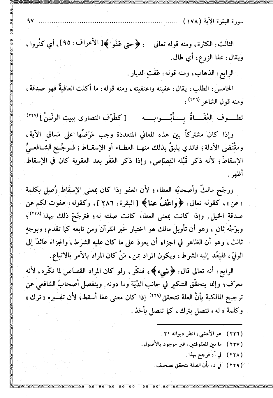 وَإِذَا كَانَ مُشْتَرَكًا بَيْنَ هَذِهِ الْمَعَانِي الْمُتَعَدِّدَةِ وَجَبَ عَرْضُهَا عَلَى مَسَاقِ الْآيَةِ، وَمُقْتَضَى الْأَدِلَّةِ؛ فَاَلَّذِي يَلِيقُ بِذَلِكَ مِنْهَا الْعَطَاءُ أَوْ الْإِسْقَاطُ؛ فَرَجَّحَ الشَّافِعِيُّ الْإِسْقَاطَ؛ لِأَنَّهُ ذُكِرَ قَبْلَهُ الْقِصَاصُ، وَإِذَا ذُكِرَ الْعَفْوُ بَعْدَ الْعُقُوبَةِ كَانَ فِي الْإِسْقَاطِ أَظْهَرُ.