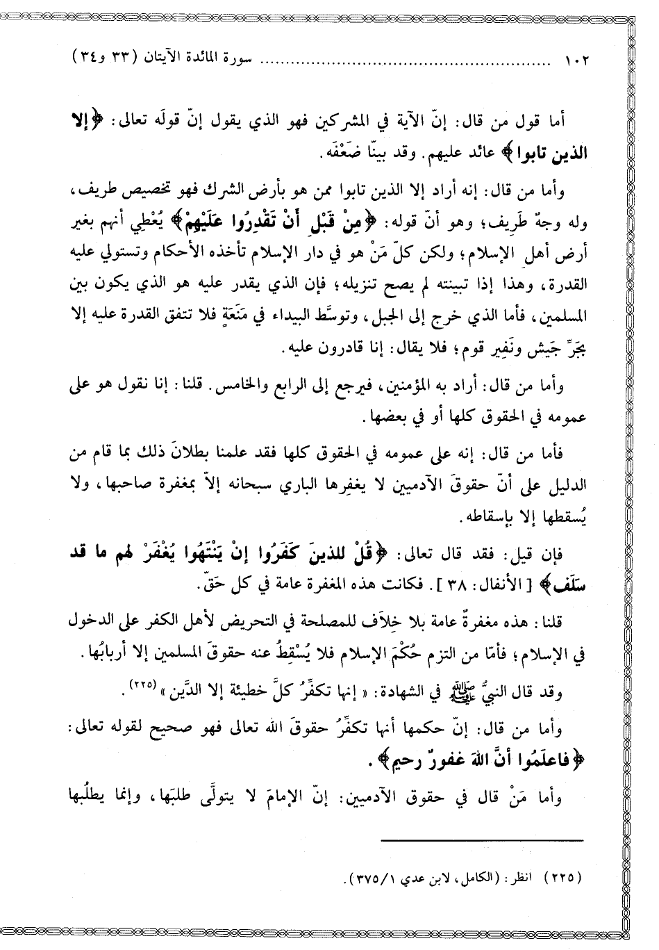 وَأَمَّا مَنْ قَالَ: أَرَادَ بِهِ الْمُؤْمِنِينَ، فَيَرْجِعُ إلَى الرَّابِعِ وَالْخَامِسِ. قُلْنَا: إنَّا نَقُولُ هُوَ عَلَى عُمُومِهِ فِي الْحُقُوقِ كُلِّهَا أَوْ فِي بَعْضِهَا. فَأَمَّا مَنْ قَالَ: إنَّهُ عَلَى عُمُومِهِ فِي الْحُقُوقِ كُلِّهَا فَقَدْ عَلِمْنَا بُطْلَانَ ذَلِكَ بِمَا قَامَ مِنْ الدَّلِيلِ عَلَى أَنَّ حُقُوقَ الْآدَمِيِّينَ لَا يَغْفِرُهَا الْبَارِّي سُبْحَانَهُ إلَّا بِمَغْفِرَةِ صَاحِبِهَا، وَلَا يُسْقِطُهَا إلَّا بِإِسْقَاطِهِ. فَإِنْ قِيلَ: فَقَدْ قَالَ تَعَالَى: {قُلْ لِلَّذِينَ كَفَرُوا إِنْ يَنْتَهُوا يُغْفَرْ لَهُمْ مَا قَدْ سَلَفَ} [الأنفال: 38]. فَكَانَتْ هَذِهِ الْمَغْفِرَةُ عَامَّةً فِي كُلِّ حَقٍّ. قُلْنَا: هَذِهِ مَغْفِرَةٌ عَامَّةٌ بِلَا خِلَافٍ لِلْمَصْلَحَةِ فِي التَّحْرِيضِ لِأَهْلِ الْكُفْرِ عَلَى الدُّخُولِ فِي الْإِسْلَامِ؛ فَأَمَّا مَنْ الْتَزَمَ حُكْمَ الْإِسْلَامِ فَلَا يُسْقِطُ عَنْهُ حُقُوقَ الْمُسْلِمِينَ إلَّا أَرْبَابُهَا. وَقَدْ «قَالَ النَّبِيُّ - صَلَّى اللَّهُ عَلَيْهِ وَسَلَّمَ - فِي الشَّهَادَةِ: إنَّهَا تُكَفِّرُ كُلَّ خَطِيئَةٍ إلَّا الدَّيْنَ». وَأَمَّا مَنْ قَالَ: إنَّ حُكْمَهَا أَنَّهَا تُكَفِّرُ حُقُوقَ اللَّهِ تَعَالَى فَهُوَ صَحِيحٌ لِقَوْلِهِ تَعَالَى: {فَاعْلَمُوا أَنَّ اللَّهَ غَفُورٌ رَحِيمٌ} [المائدة: 34]. وَأَمَّا مَنْ قَالَ فِي حُقُوقِ الْآدَمِيِّينَ: إنَّ الْإِمَامَ لَا يَتَوَلَّى طَلَبَهَا، وَإِنَّمَا يَطْلُبُهَا