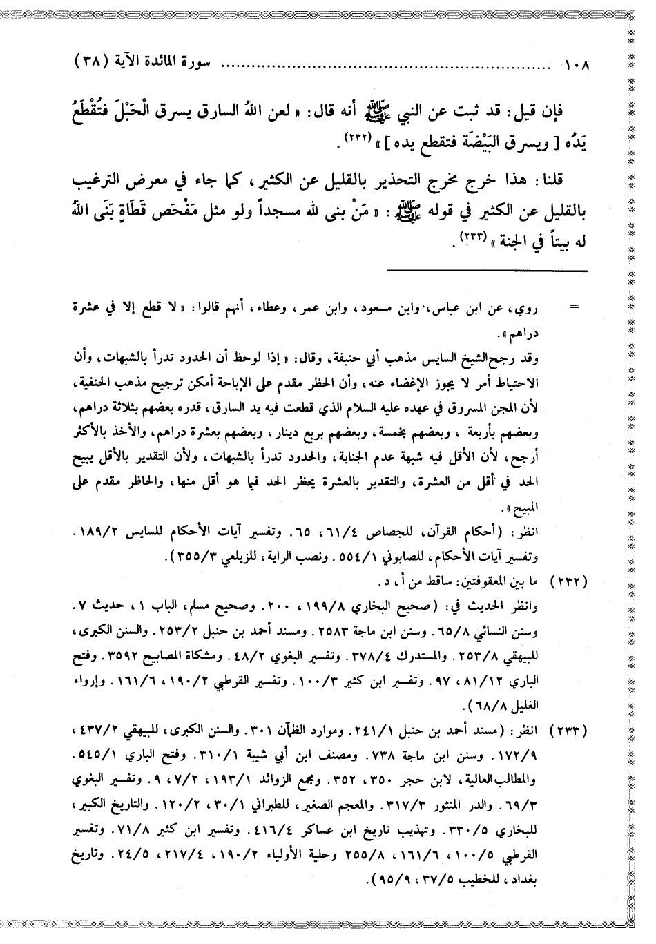 فَإِنْ قِيلَ: قَدْ ثَبَتَ عَنْ النَّبِيِّ - صَلَّى اللَّهُ عَلَيْهِ وَسَلَّمَ - أَنَّهُ قَالَ: «لَعَنَ اللَّهُ السَّارِقَ يَسْرِقُ الْحَبْلَ فَتُقْطَعُ يَدُهُ وَيَسْرِقُ الْبَيْضَةَ فَتُقْطَعُ يَدُهُ» قُلْنَا: هَذَا خَرَجَ مَخْرَجَ التَّحْذِيرِ بِالْقَلِيلِ عَنْ الْكَثِيرِ، كَمَا جَاءَ فِي مَعْرَضِ التَّرْغِيبِ بِالْقَلِيلِ عَنْ الْكَثِيرِ فِي قَوْلِهِ - صَلَّى اللَّهُ عَلَيْهِ وَسَلَّمَ -: «مَنْ بَنَى لِلَّهِ مَسْجِدًا وَلَوْ مِثْلَ مَفْحَصِ قَطَاةِ بَنَى اللَّهُ لَهُ بَيْتًا فِي الْجَنَّةِ».