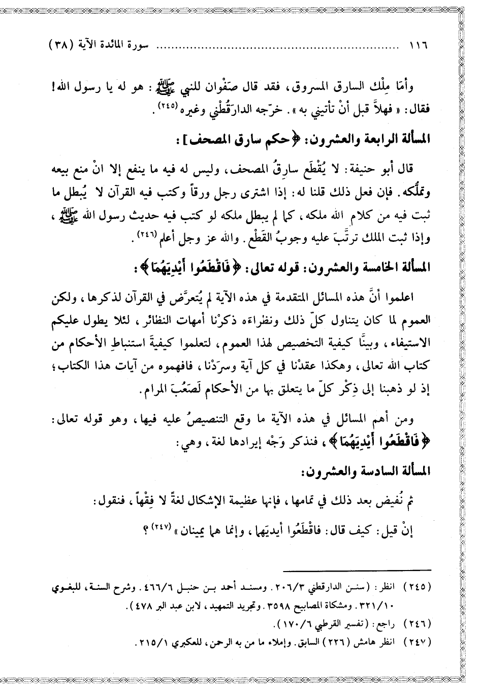 الْمَسْأَلَةُ الْخَامِسَةُ وَالْعِشْرُونَ: قَوْله تَعَالَى: {فَاقْطَعُوا أَيْدِيَهُمَا} [المائدة: 38] اعْلَمُوا أَنَّ هَذِهِ الْمَسَائِلَ الْمُتَقَدِّمَةَ فِي هَذِهِ الْآيَةِ لَمْ يُتَعَرَّضْ فِي الْقُرْآنِ لِذِكْرِهَا، وَلَكِنَّ الْعُمُومَ لَمَّا كَانَ يَتَنَاوَلُ كُلَّ ذَلِكَ وَنُظَرَاءَهُ ذَكَرْنَا أُمَّهَاتِ النَّظَائِرِ، لِئَلَّا يَطُولَ عَلَيْكُمْ الِاسْتِيفَاءُ، وَبَيَّنَّا كَيْفِيَّةَ التَّخْصِيصِ لِهَذَا الْعُمُومِ، لِتَعْلَمُوا كَيْفِيَّةَ اسْتِنْبَاطِ الْأَحْكَامِ مِنْ كِتَابِ اللَّهِ تَعَالَى، وَهَكَذَا عَقَدْنَا فِي كُلِّ آيَةٍ وَسَرَدْنَا، فَافْهَمُوهُ مِنْ آيَاتِ هَذَا الْكِتَابِ؛ إذْ لَوْ ذَهَبْنَا إلَى ذِكْرِ كُلِّ مَا يَتَعَلَّقُ بِهَا مِنْ الْأَحْكَامِ لَصَعُبَ الْمَرَامُ. وَمِنْ أَهَمِّ الْمَسَائِلِ فِي هَذِهِ الْآيَةِ مَا وَقَعَ التَّنْصِيصُ عَلَيْهِ فِيهَا، وَهُوَ قَوْله تَعَالَى: {فَاقْطَعُوا أَيْدِيَهُمَا} [المائدة: 38]، فَنَذْكُرُ وَجْهَ إيرَادِهَا لُغَةً، وَهِيَ: