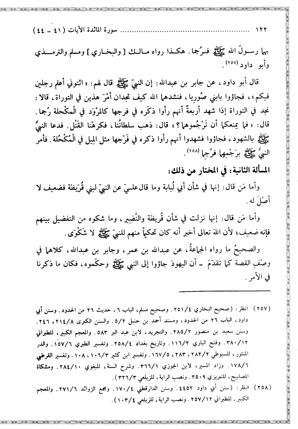 بِهِمَا رَسُولُ اللَّهِ - صَلَّى اللَّهُ عَلَيْهِ وَسَلَّمَ - فَرُجِمَا». هَكَذَا رَوَاهُ مَالِكٌ [وَالْبُخَارِيُّ] وَمُسْلِمٌ وَالتِّرْمِذِيُّ وَأَبُو دَاوُد. قَالَ أَبُو دَاوُد عَنْ جَابِرِ بْنِ عَبْدِ اللَّهِ: «إنَّ النَّبِيَّ - صَلَّى اللَّهُ عَلَيْهِ وَسَلَّمَ - قَالَ لَهُمْ: ائْتُونِي أَعْلَمَ رَجُلَيْنِ فِيكُمْ فَجَاءُوا بِابْنَيْ صُورِيَّا، فَنَشَدَهُمَا اللَّهَ كَيْفَ تَجِدَانِ أَمَرَ هَذَيْنِ فِي التَّوْرَاةِ قَالَا: نَجِدُ فِي التَّوْرَاةِ إذَا شَهِدَ أَرْبَعَةٌ أَنَّهُمْ رَأَوْا ذَكَرَهُ فِي فَرْجِهَا كَالْمِرْوَدِ فِي الْمُكْحُلَةِ رُجِمَا. قَالَ: فَمَا يَمْنَعُكُمَا أَنْ تَرْجُمُوهُمَا؟ قَالَ: ذَهَبَ سُلْطَانُنَا، فَكَرِهْنَا الْقَتْلَ. فَدَعَا النَّبِيُّ - صَلَّى اللَّهُ عَلَيْهِ وَسَلَّمَ - بِالشُّهُودِ، فَجَاءُوا فَشَهِدُوا أَنَّهُمْ رَأَوْا ذَكَرَهُ فِي فَرْجِهَا مِثْلَ الْمِيلِ فِي الْمُكْحُلَةِ. فَأَمَرَ النَّبِيُّ - صَلَّى اللَّهُ عَلَيْهِ وَسَلَّمَ - بِرَجْمِهِمَا فَرُجِمَا».