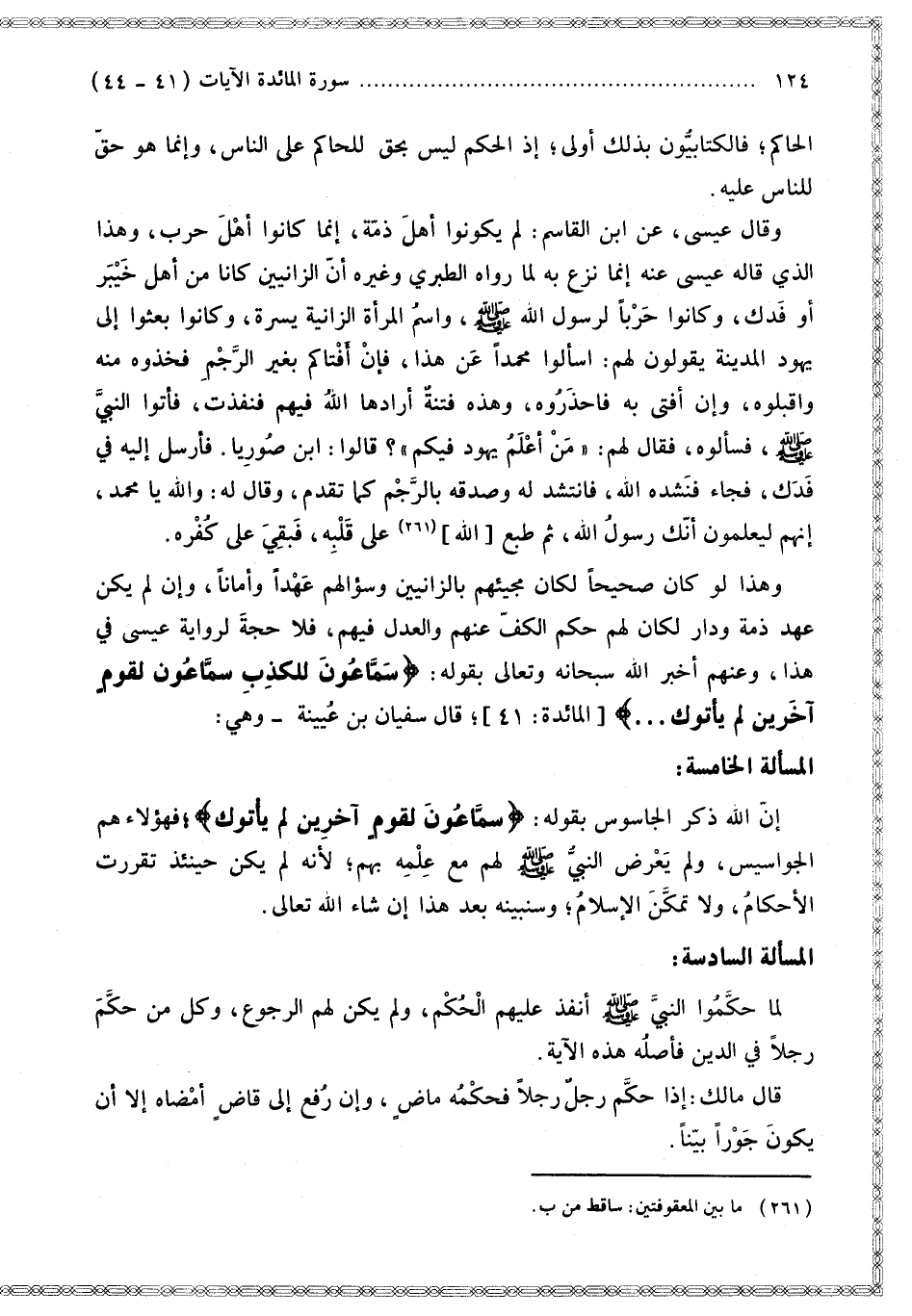 قَالَ سُفْيَانُ بْنُ عُيَيْنَةَ وَهِيَ: الْمَسْأَلَةُ الْخَامِسَةُ: إنَّ اللَّهَ ذَكَرَ الْجَاسُوسَ بِقَوْلِهِ: {سَمَّاعُونَ لِقَوْمٍ آخَرِينَ لَمْ يَأْتُوكَ} [المائدة: 41]؛ فَهَؤُلَاءِ هُمْ الْجَوَاسِيسُ، وَلَمْ يَعْرِضْ النَّبِيُّ - صَلَّى اللَّهُ عَلَيْهِ وَسَلَّمَ - لَهُمْ مَعَ عِلْمِهِ بِهِمْ؛ لِأَنَّهُ لَمْ يَكُنْ حِينَئِذٍ تَقَرَّرَتْ الْأَحْكَامُ، وَلَا تَمَكَّنَ الْإِسْلَامُ؛ وَسَنُبَيِّنُهُ بَعْدَ هَذَا إنْ شَاءَ اللَّهُ تَعَالَى.