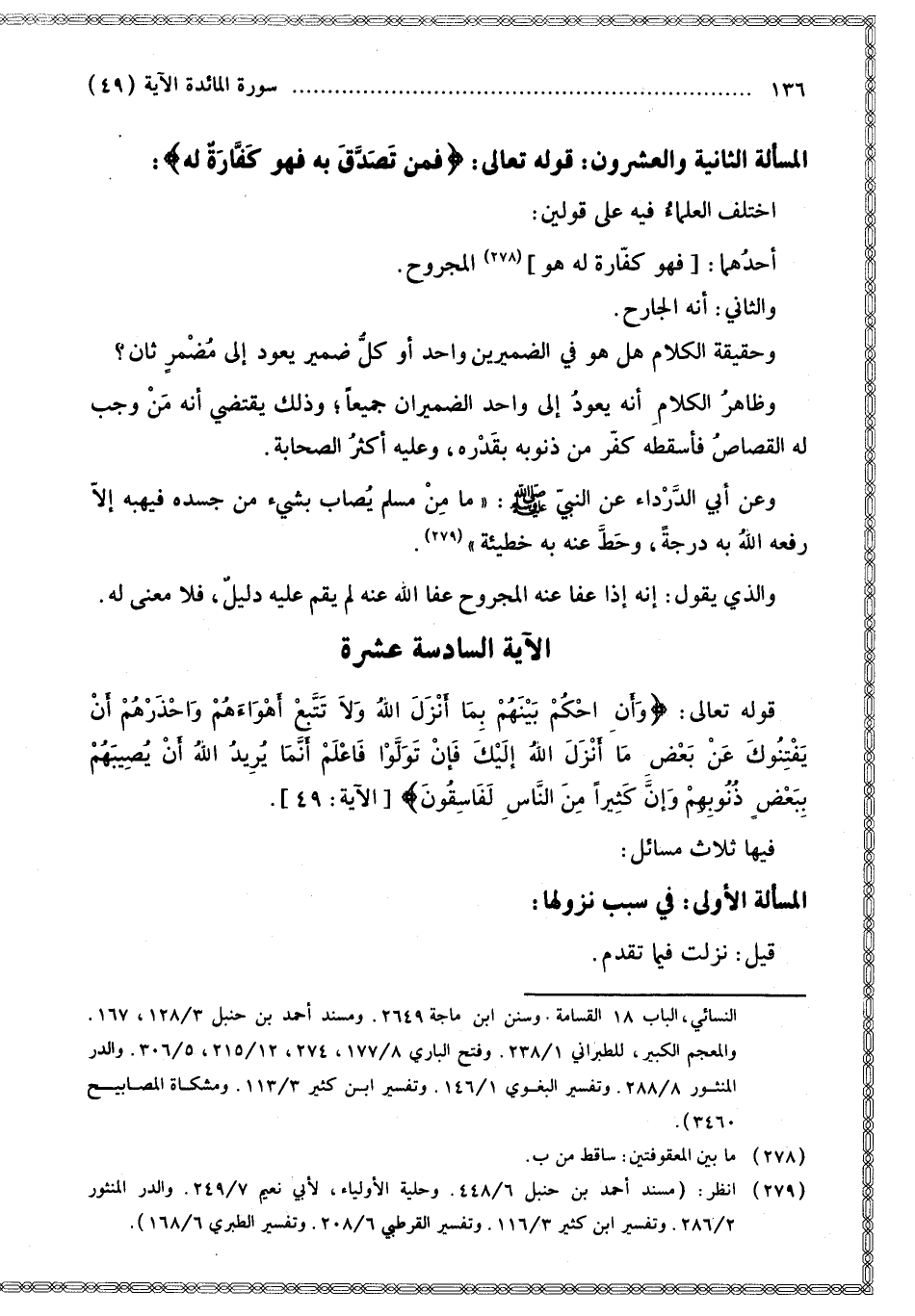 ْ وَاحْذَرْهُمْ أَنْ يَفْتِنُوكَ عَنْ بَعْضِ مَا أَنْزَلَ اللَّهُ إِلَيْكَ فَإِنْ تَوَلَّوْا فَاعْلَمْ أَنَّمَا يُرِيدُ اللَّهُ أَنْ يُصِيبَهُمْ بِبَعْضِ ذُنُوبِهِمْ وَإِنَّ كَثِيرًا مِنَ النَّاسِ لَفَاسِقُونَ} [المائدة: 49]. فِيهَا ثَلَاثُ مَسَائِلَ: