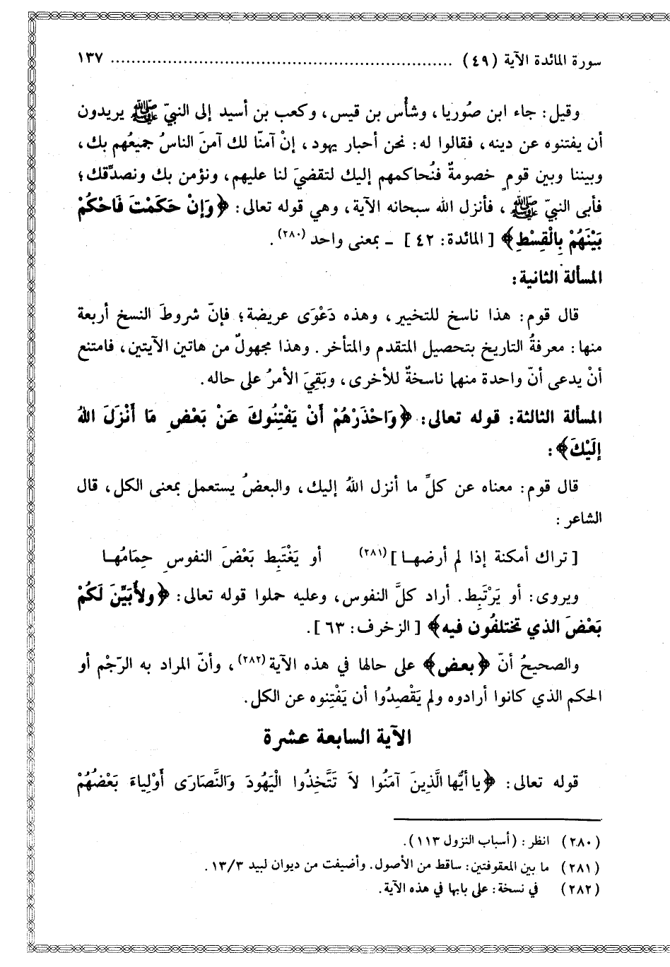 وَقِيلَ: «جَاءَ ابْنُ صُورِيَّا، وَشَأْسُ بْنُ قَيْسٍ، وَكَعْبُ بْنُ أُسَيْدَ إلَى النَّبِيِّ - صَلَّى اللَّهُ عَلَيْهِ وَسَلَّمَ - يُرِيدُونَ أَنْ يَفْتِنُوهُ عَنْ دِينِهِ، فَقَالُوا لَهُ: نَحْنُ أَحْبَارَ يَهُودَ، إنْ آمَنَّا لَك آمَنَ النَّاسُ جَمِيعُهُمْ بِك، وَبَيْنَنَا وَبَيْنَ قَوْمٍ خُصُومَةٌ فَنُحَاكِمُهُمْ إلَيْك لِتَقْضِيَ لَنَا عَلَيْهِمْ، وَنُؤْمِنُ بِك وَنُصَدِّقُك؛ فَأَبَى النَّبِيُّ - صَلَّى اللَّهُ عَلَيْهِ وَسَلَّمَ - فَأَنْزَلَ اللَّهُ سُبْحَانَهُ الْآيَةَ، وَهِيَ قَوْله تَعَالَى: {وَإِنْ حَكَمْتَ فَاحْكُمْ بَيْنَهُمْ بِالْقِسْطِ} [المائدة: 42]» بِمَعْنَى وَاحِدٍ. الْمَسْأَلَةُ الثَّانِيَةُ: قَالَ قَوْمٌ: هَذَا نَاسِخٌ لِلتَّخْيِيرِ، وَهَذِهِ دَعْوَى عَرِيضَةٌ؛ فَإِنَّ شُرُوطَ النُّسَخِ أَرْبَعَةٌ مِنْهَا: مَعْرِفَةُ التَّارِيخِ بِتَحْصِيلِ الْمُتَقَدِّمِ وَالْمُتَأَخِّرِ. وَهَذَا مَجْهُولٌ مِنْ هَاتَيْنِ الْآيَتَيْنِ، فَامْتَنَعَ أَنْ يُدَّعَى أَنَّ وَاحِدَةً مِنْهُمَا نَاسِخَةٌ لِلْأُخْرَى، وَبَقِيَ الْأَمْرُ عَلَى حَالِهِ.
