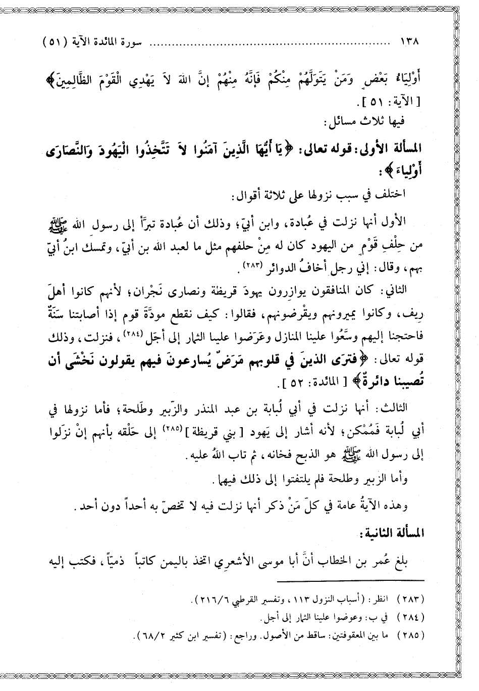 الْمَسْأَلَةُ الْأُولَى: قَوْله تَعَالَى: {يَا أَيُّهَا الَّذِينَ آمَنُوا لا تَتَّخِذُوا الْيَهُودَ وَالنَّصَارَى أَوْلِيَاءَ} [المائدة: 51] اُخْتُلِفَ فِي سَبَبِ نُزُولِهَا عَلَى ثَلَاثَةِ أَقْوَالٍ: