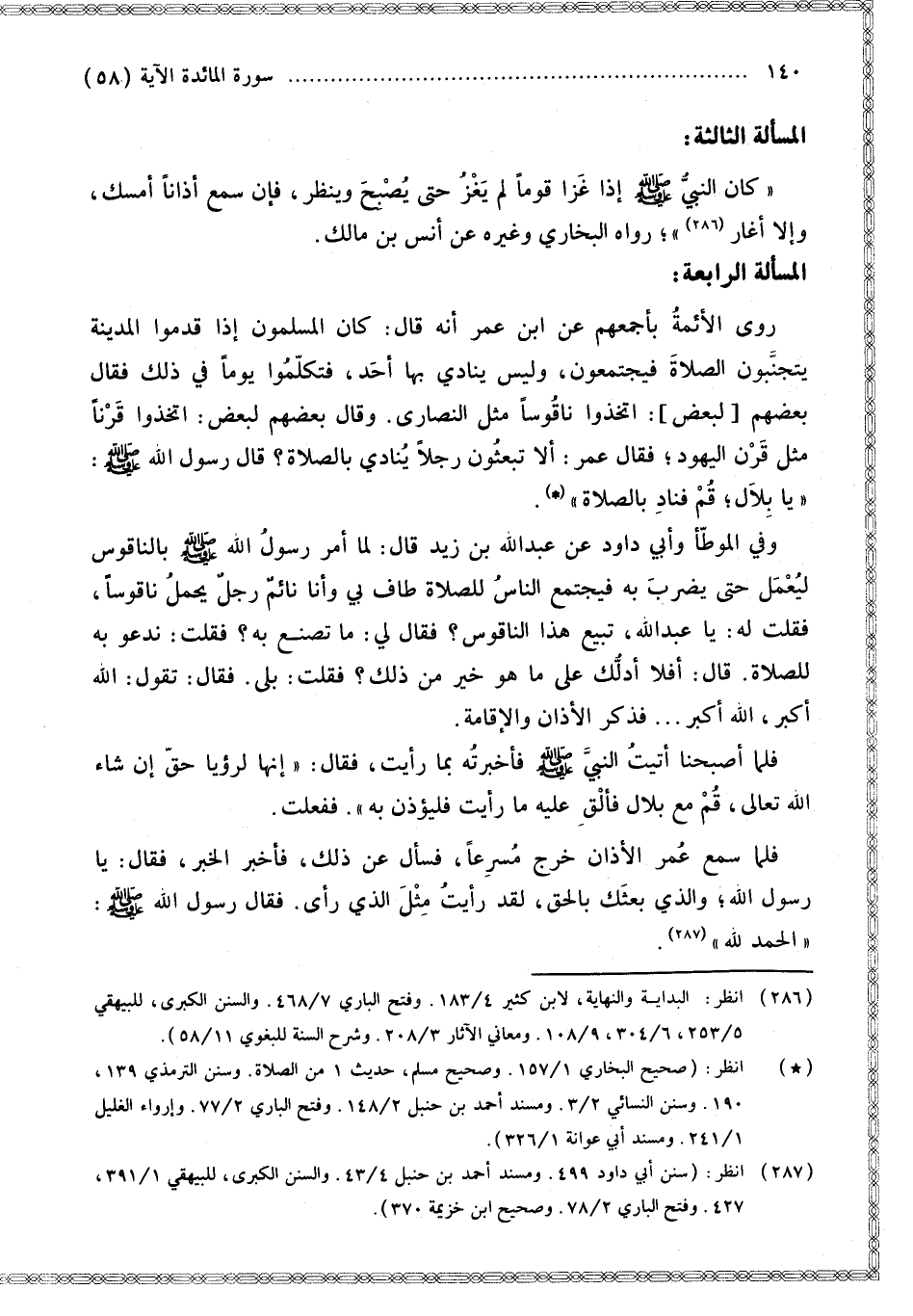 الْمَسْأَلَةُ الرَّابِعَةُ: رَوَى الْأَئِمَّةُ بِأَجْمَعِهِمْ عَنْ ابْنِ عُمَرَ أَنَّهُ قَالَ: «كَانَ الْمُسْلِمُونَ إذَا قَدِمُوا الْمَدِينَةَ يَتَجَنَّبُونَ الصَّلَاةَ فَيَجْتَمِعُونَ، وَلَيْسَ يُنَادِي بِهَا أَحَدٌ، فَتَكَلَّمُوا يَوْمًا فِي ذَلِكَ فَقَالَ بَعْضُهُمْ لِبَعْضٍ: اتَّخِذُوا نَاقُوسًا مِثْلَ النَّصَارَى. وَقَالَ بَعْضُهُمْ لِبَعْضِ: اتَّخِذُوا قَرْنًا مِثْل قَرْنِ الْيَهُودِ؛ فَقَالَ عُمَرُ: أَلَا تَبْعَثُونَ رَجُلًا يُنَادِي بِالصَّلَاةِ؟ قَالَ رَسُولُ اللَّهِ - صَلَّى اللَّهُ عَلَيْهِ وَسَلَّمَ -: يَا بِلَالُ؛ قُمْ فَنَادِ بِالصَّلَاةِ».
