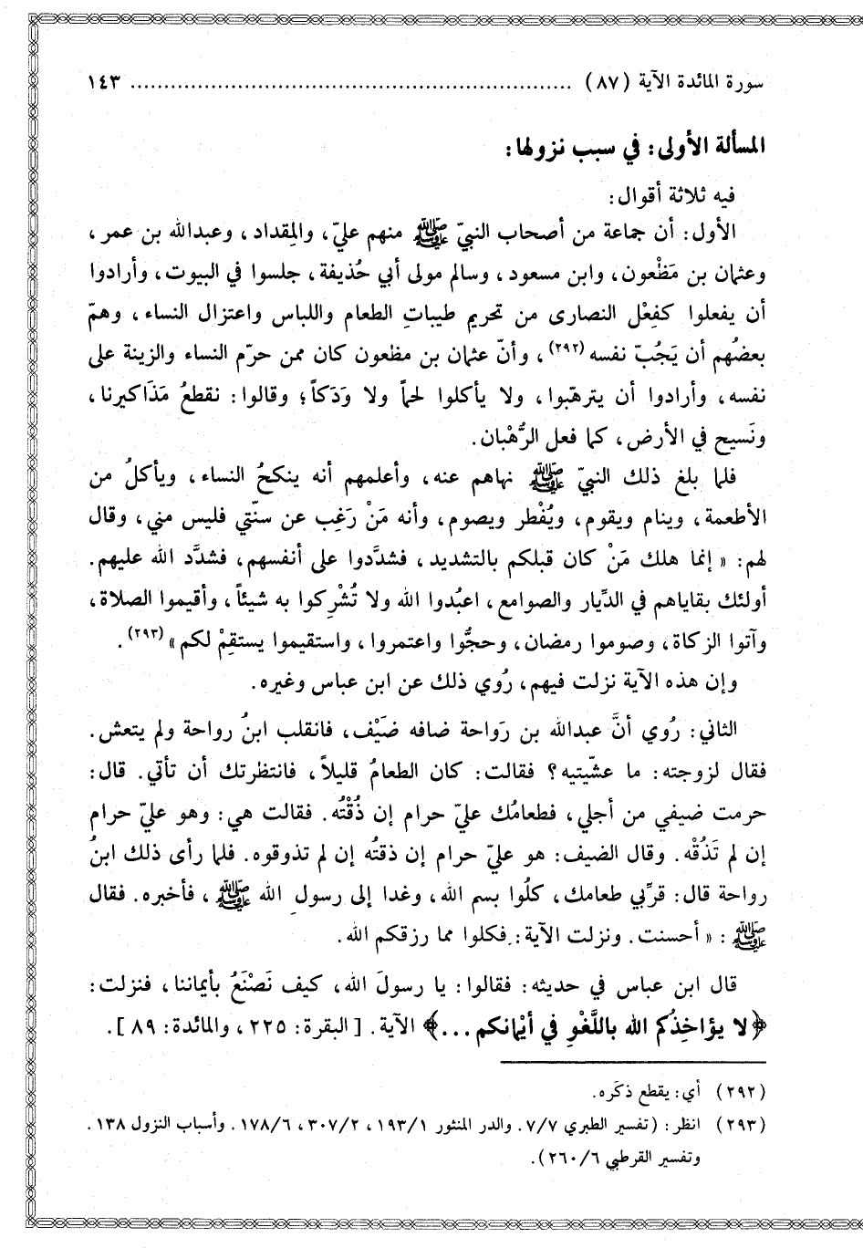 الثَّانِي: رُوِيَ «أَنَّ عَبْدَ اللَّهِ بْنَ رَوَاحَةَ ضَافَهُ ضَيْفٌ، فَانْقَلَبَ ابْنُ رَوَاحَةَ وَلَمْ يَتَعَشَّ. فَقَالَ لِزَوْجَتِهِ: مَا عَشَّيْتِيهِ؟ فَقَالَتْ: كَانَ الطَّعَامُ قَلِيلًا، فَانْتَظَرْتُك أَنْ تَأْتِيَ. قَالَ: حَرَمْت ضَيْفِي مِنْ أَجْلِي، فَطَعَامُك عَلَيَّ حَرَامٌ إنْ ذُقْته. فَقَالَتْ هِيَ: وَهُوَ عَلَيَّ حَرَامٌ إنْ لَمْ تُذَقْهُ. وَقَالَ الضَّيْفُ: هُوَ عَلَيَّ حَرَامٌ إنْ ذُقْته إنْ لَمْ تَذُوقُوهُ. فَلَمَّا رَأَى ذَلِكَ ابْنُ رَوَاحَةَ قَالَ: قَرِّبِي طَعَامَك، كُلُوا بِسْمِ اللَّهِ، وَغَدَا إلَى رَسُولِ اللَّهِ - صَلَّى اللَّهُ عَلَيْهِ وَسَلَّمَ - فَأَخْبَرَهُ. فَقَالَ - صَلَّى اللَّهُ عَلَيْهِ وَسَلَّمَ -: أَحْسَنْت. وَنَزَلَتْ الْآيَةُ: فَكُلُوا مِمَّا رَزَقَكُمْ اللَّهُ.» قَالَ ابْنُ عَبَّاسٍ فِي حَدِيثِهِ: «فَقَالُوا: يَا رَسُولَ اللَّهِ، كَيْفَ نَصْنَعُ بِأَيْمَانِنَا، فَنَزَلَتْ: {لا يُؤَاخِذُكُمُ اللَّهُ بِاللَّغْوِ فِي أَيْمَانِكُمْ} [البقرة: 225]».