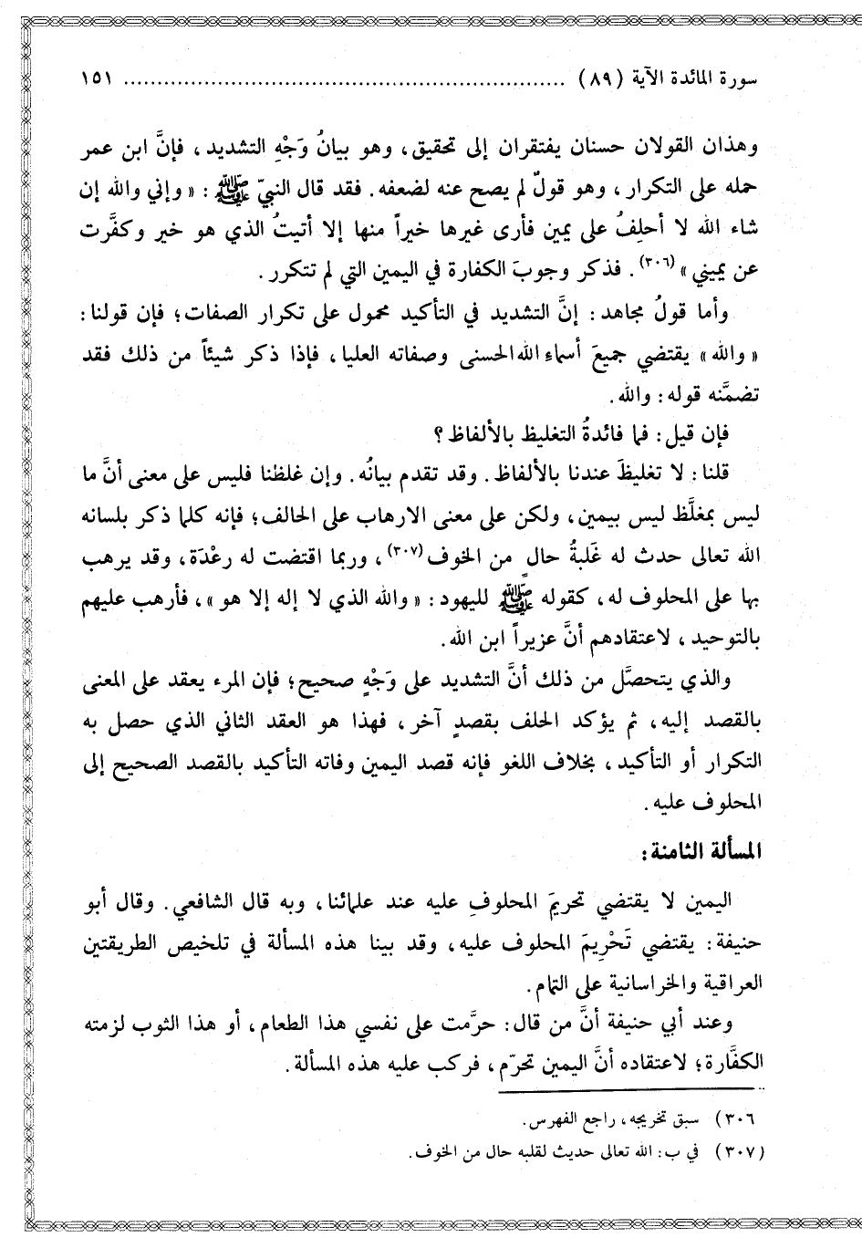 وَهَذَانِ الْقَوْلَانِ حَسَنَانِ يَفْتَقِرَانِ إلَى تَحْقِيقٍ، وَهُوَ بَيَانُ وَجْهِ التَّشْدِيدِ، فَإِنَّ ابْنَ عُمَرَ حَمَلَهُ عَلَى التَّكْرَارِ، وَهُوَ قَوْلٌ لَمْ يَصِحَّ عَنْهُ لِضَعْفِهِ. فَقَدْ قَالَ النَّبِيُّ - صَلَّى اللَّهُ عَلَيْهِ وَسَلَّمَ - «وَإِنِّي وَاَللَّهِ إنْ شَاءَ اللَّهُ لَا أَحْلِفُ عَلَى يَمِينٍ فَأَرَى غَيْرَهَا خَيْرًا مِنْهَا إلَّا أَتَيْت الَّذِي هُوَ خَيْرٌ وَكَفَّرْت عَنْ يَمِينِي». فَذَكَرَ وُجُوبَ الْكَفَّارَةِ فِي الْيَمِينِ الَّتِي لَمْ تَتَكَرَّرْ.