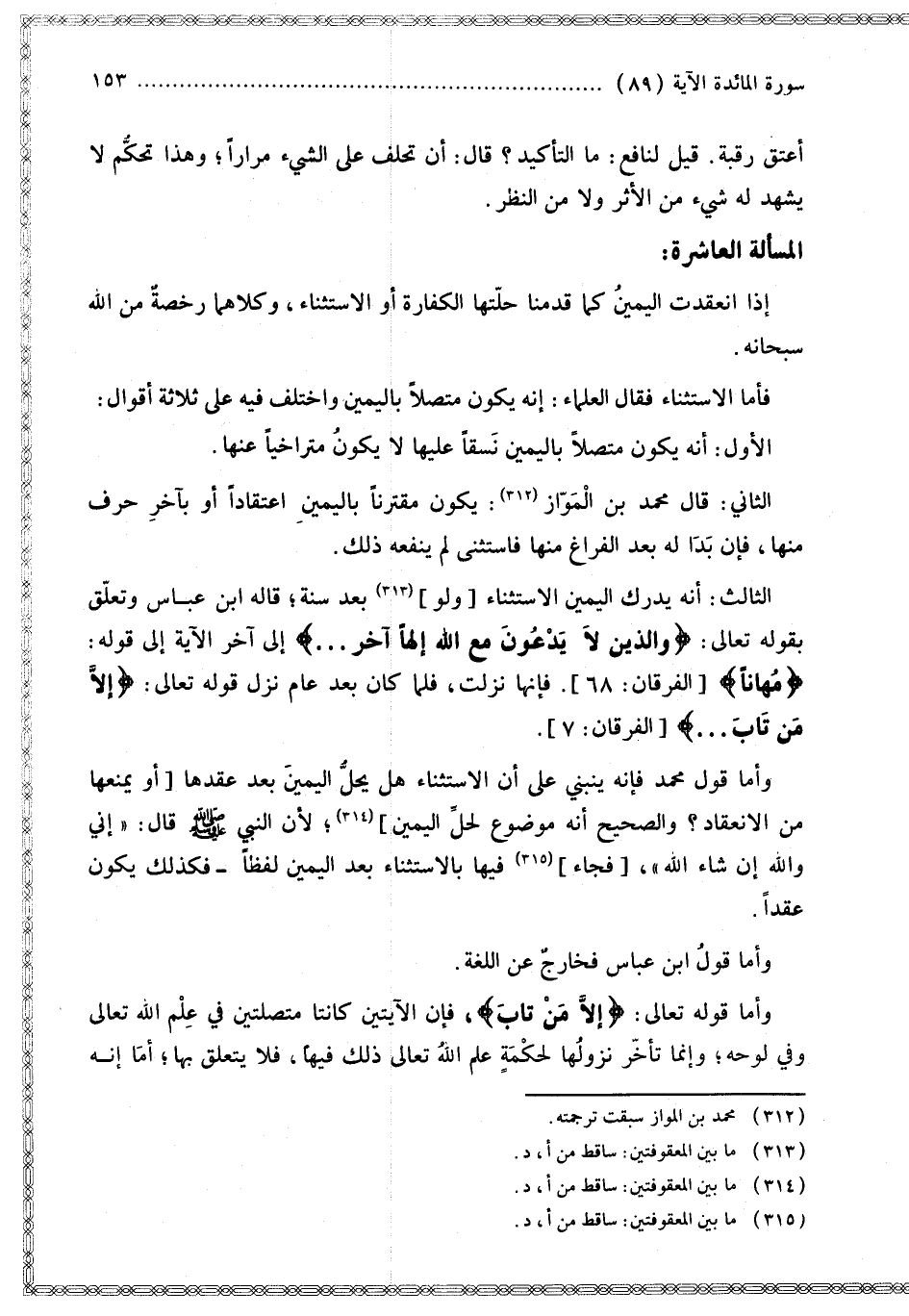 وَأَمَّا قَوْلُ ابْنِ عَبَّاسٍ فَخَارِجٌ عَنْ اللُّغَةِ. وَأَمَّا قَوْله تَعَالَى: {إِلا مَنْ تَابَ} [الفرقان: 70] فَإِنَّ الْآيَتَيْنِ كَانَتَا مُتَّصِلَتَيْنِ فِي عِلْمِ اللَّهِ تَعَالَى وَفِي لَوْحِهِ؛ وَإِنَّمَا تَأَخَّرَ نُزُولُهَا لِحِكْمَةِ عِلْمِ اللَّهِ تَعَالَى ذَلِكَ فِيهَا، فَلَا يَتَعَلَّقُ بِهَا؛ أَمَّا إنَّهُ