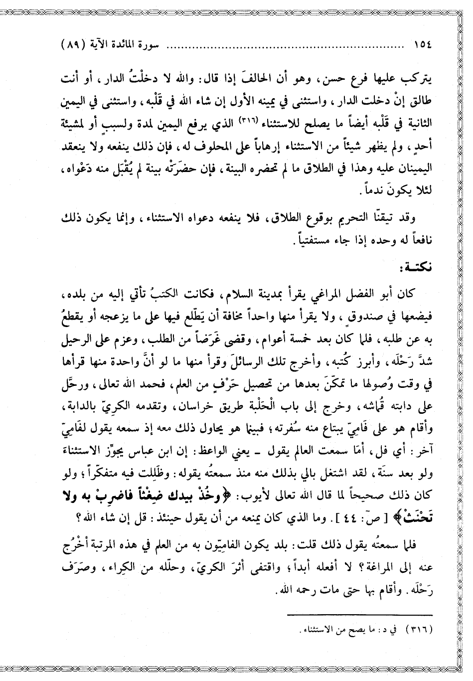 وَقَدْ تَيَقَّنَّا التَّحْرِيمَ بِوُقُوعِ الطَّلَاقِ، فَلَا يَنْفَعُهُ دَعْوَاهُ الِاسْتِثْنَاءَ، وَإِنَّمَا يَكُونُ ذَلِكَ نَافِعًا لَهُ وَحْدَهِ إذَا جَاءَ مُسْتَفْتِيًا. نُكْتَةٌ: كَانَ أَبُو الْفَضْلِ الْمَرَاغِيُّ يَقْرَأُ بِمَدِينَةِ السَّلَامِ، فَكَانَتْ الْكُتُبُ تَأْتِي إلَيْهِ مِنْ بَلَدِهِ، فَيَضَعُهَا فِي صُنْدُوقٍ، وَلَا يَقْرَأُ مِنْهَا وَاحِدًا مَخَافَةَ أَنْ يَطَّلِعَ فِيهَا عَلَى مَا يُزْعِجُهُ أَوْ يَقْطَعُ بِهِ عَنْ طَلَبِهِ، فَلَمَّا كَانَ بَعْدَ خَمْسَةِ أَعْوَامٍ، وَقَضَى غَرَضًا مِنْ الطَّلَبِ، وَعَزَمَ عَلَى الرَّحِيلِ شَدَّ رَحْلَهُ، وَأَبْرَزَ كُتُبَهُ، وَأَخْرَجَ تِلْكَ الرَّسَائِلِ وَقَرَأَ مِنْهَا مَا لَوْ أَنَّ وَاحِدَةً مِنْهَا قَرَأَهَا فِي وَقْتِ وُصُولِهَا مَا تَمَكَّنَ بَعْدَهَا مِنْ تَحْصِيلِ حَرْفٍ مِنْ الْعِلْمِ، فَحَمِدَ اللَّهَ تَعَالَى، وَرَحَّلَ عَلَى دَابَّتِهِ قاشه، وَخَرَجَ إلَى بَابِ الْحَلْبَةِ طَرِيقِ خُرَاسَانَ، وَتَقَدَّمَهُ الْكَرِيُّ بِالدَّابَّةِ، وَأَقَامَ هُوَ عَلَى فَامِيٍّ يَبْتَاعُ مِنْهُ سُفْرَتَهُ؛ فَبَيْنَمَا هُوَ يُحَاوِلُ ذَلِكَ مَعَهُ إذْ سَمِعَهُ يَقُولُ لِفَامِيٍّ آخَرَ: أَيْ فُلَ، أَمَا سَمِعْت الْعَالِمَ يَقُولُ يَعْنِي الْوَاعِظَ: إنَّ ابْنَ عَبَّاسٍ يُجَوِّزُ الِاسْتِثْنَاءَ وَلَوْ بَعْدَ سَنَةٍ، لَقَدْ اشْتَغَلَ بَالِي بِذَلِكَ مِنْهُ مُنْذُ سَمِعْته يَقُولُهُ: وَظَلَلْتُ فِيهِ مُتَفَكِّرًا؛ وَلَوْ كَانَ ذَلِكَ صَحِيحًا لَمَا قَالَ اللَّهُ تَعَالَى لِأَيُّوبَ: {وَخُذْ بِيَدِكَ ضِغْثًا فَاضْرِبْ بِهِ وَلا تَحْنَثْ} [ص: 44]. وَمَا الَّذِي كَانَ يَمْنَعُهُ مِنْ أَنْ يَقُولَ حِينَئِذٍ: قُلْ إنْ شَاءَ اللَّهُ؟ فَلَمَّا سَمِعْته يَقُولُ ذَلِكَ قُلْت: بَلَدٌ يَكُونُ الْفَامِيُّونَ بِهِ مِنْ الْعِلْمِ فِي هَذِهِ الْمَرْتَبَةِ أَخْرُجُ عَنْهُ إلَى الْمَرَاغَةِ؟ لَا أَفْعَلُهُ أَبَدًا؛ وَاقْتَفَى أَثَرَ الْكَرِيِّ، وَحَلَّلَهُ مِنْ الْكِرَاءِ، وَصَرَفَ رَحْلَهُ. وَأَقَامَ بِهَا حَتَّى مَاتَ - رَحِمَهُ اللَّهُ -.