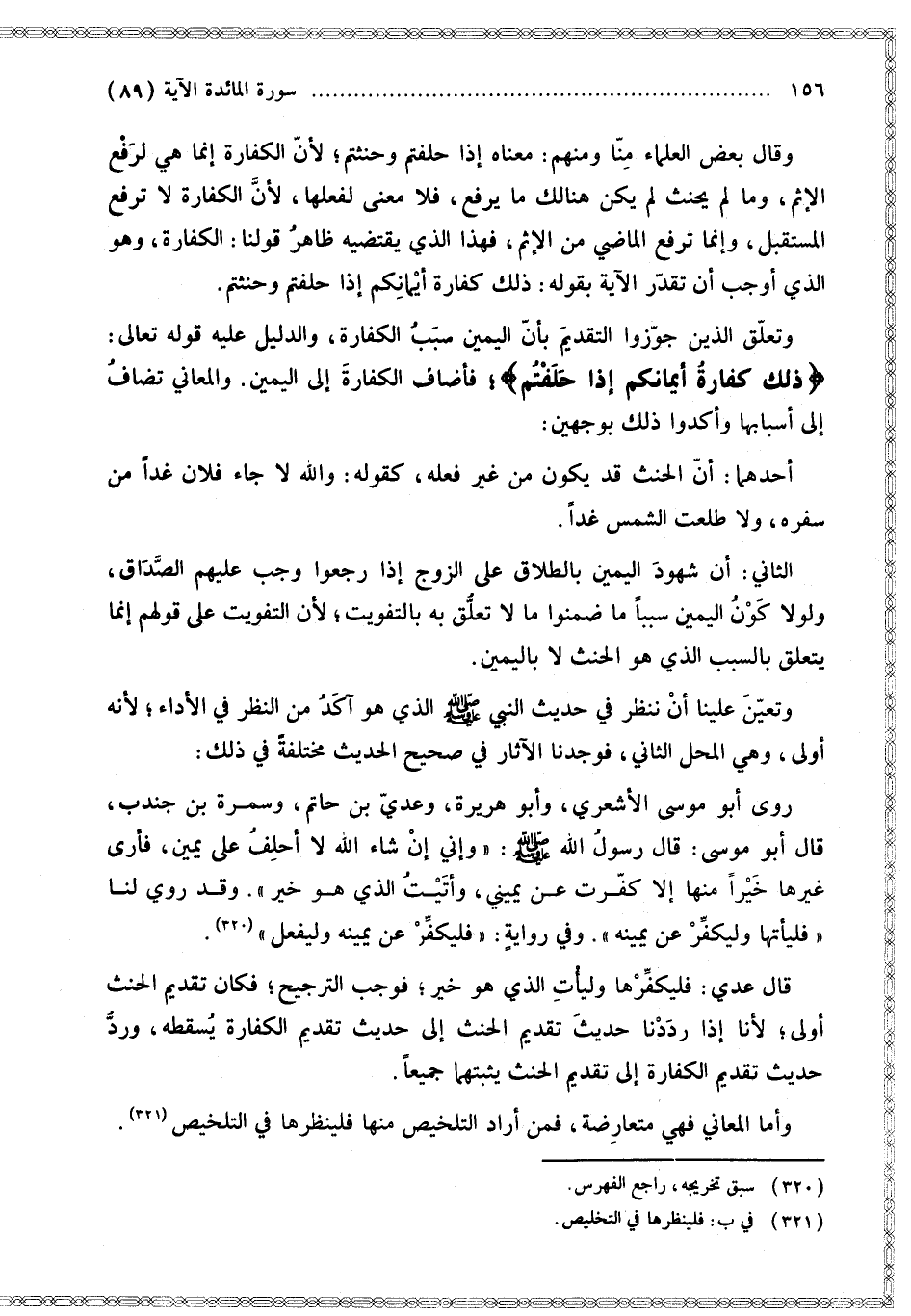 وَتَعَلَّقَ الَّذِينَ جَوَّزُوا التَّقْدِيمَ بِأَنَّ الْيَمِينَ سَبَبُ الْكَفَّارَةِ، وَالدَّلِيلُ عَلَيْهِ قَوْله تَعَالَى: {ذَلِكَ كَفَّارَةُ أَيْمَانِكُمْ إِذَا حَلَفْتُمْ} [المائدة: 89] فَأَضَافَ الْكَفَّارَةَ إلَى الْيَمِينِ. وَالْمَعَانِي تُضَافُ إلَى أَسْبَابِهَا وَأَكَّدُوا ذَلِكَ بِوَجْهَيْنِ: أَحَدُهُمَا: أَنَّ الْحِنْثَ قَدْ يَكُونُ مِنْ غَيْرِ فِعْلِهِ، كَقَوْلِهِ: وَاَللَّهِ لَا جَاءَ فُلَانٌ غَدًا مِنْ سَفَرِهِ، وَلَا طَلَعَتْ الشَّمْسُ غَدًا.